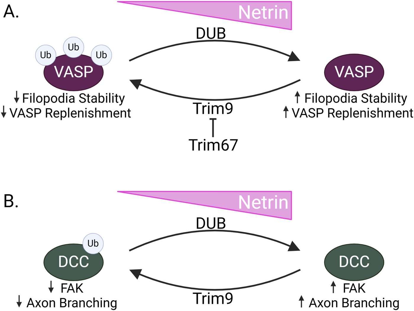 TRIM9 and TRIM67 in Netrin signaling (A) When Netrin expression is low in neurons during axon guidance, the RING E3 ligase Trim9 ubiquitinates VASP. This results in decreased filopodial stability and decreased replenishment of VASP within filopodia. Conversely, when Netrin levels are high, VASP is deubiquitinated by a deubiquitinating enzyme, resulting in increased filopodial stability and VASP replenishment. Trim67, another RING E3 ligase, inhibits Trim9, acting as a switch to allow for altered filopodial dynamics in response to Netrin. (B) Trim9 also ubiquitinates DCC when Netrin is low. This decreases FAK binding and prevents FAK-induced axon branching. In the presence of Netrin, DCC is deubiquitinated, allowing for increased FAK signaling and increased axon branching.