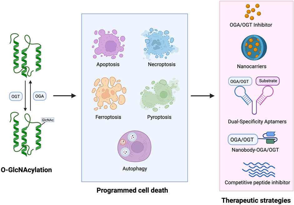 Given the adverse roles of dysregulated O-GlcNAcylation, particularly hyper-O-GlcNAc in cancers (Lu et al., 2022), targeting O-GlcNAcylation to modulate key proteins involved in PCD presents a promising strategy for clinical anti-cancer therapies.