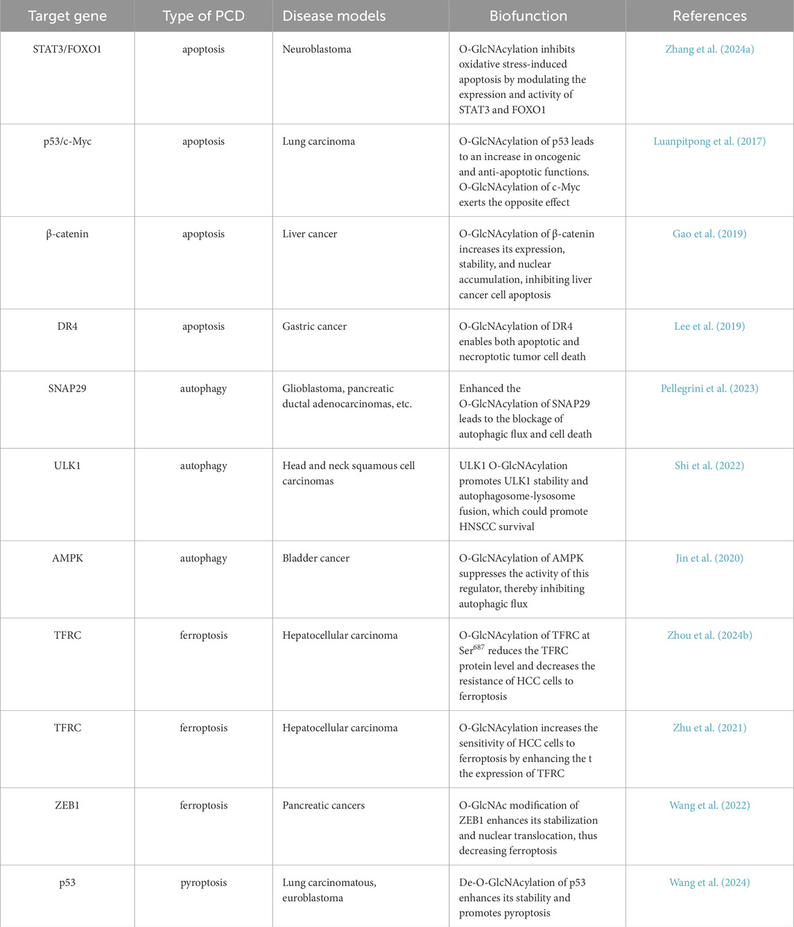 Pyroptosis is a type of cell death that is dependent on caspases. It involves the formation of pores in the cell membrane, leading to cell swelling, rupture of the plasma membrane, and the release of all intracellular contents (Huang et al., 2022). p53 is a crucial tumor suppressor, and the loss of p53 function often precedes cancer development (Zhang et al., 2020). Wang et al. show that the de-O-GlcNAcylation of p53 enhances its stability. This increased stability leads to the transcriptional upregulation of genes related to the Bcl-2 family and death receptors, promoting pyroptosis in tumor cells (Table 1) (Wang et al., 2024).
