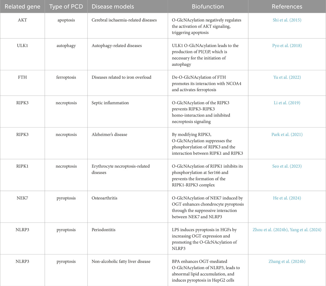 As a dual sensor for nutrient availability and cellular stress, O-GlcNAcylation is highly dynamic (Wells et al., 2002; Vosseller et al., 2001), suggesting that O-GlcNAcylation is closely related to PCD. In this discussion, we will focus on the relationship between five common types of PCD: apoptosis, autophagy, necroptosis, ferroptosis and pyroptosis, and their connection to O-GlcNAcylation (Figure 2). Investigating O-GlcNAcylation may provide new avenues for treating related diseases.