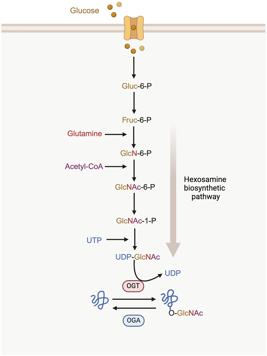 The process of hexosamine biosynthetic pathway (HBP) and protein O-GlcNAcylation. UDP-GlcNAc synthesis requires the incorporation of glucose, glutamine, acetyl-CoA and UTP. O-GlcNAc on proteins is cycled between the addition of OGT and the removal of OGA. Gluc-6-P: glucose-6-phosphatase; Fruc-6-P: fructose-6-phosphate; GlcN-6-P: glucosamine-6-phosphate; GlcNAc-6-P: N-acetylglucosamine-6-phosphate; GlcNAc-1-P: N-acetylglucosamine-1-phosphate.