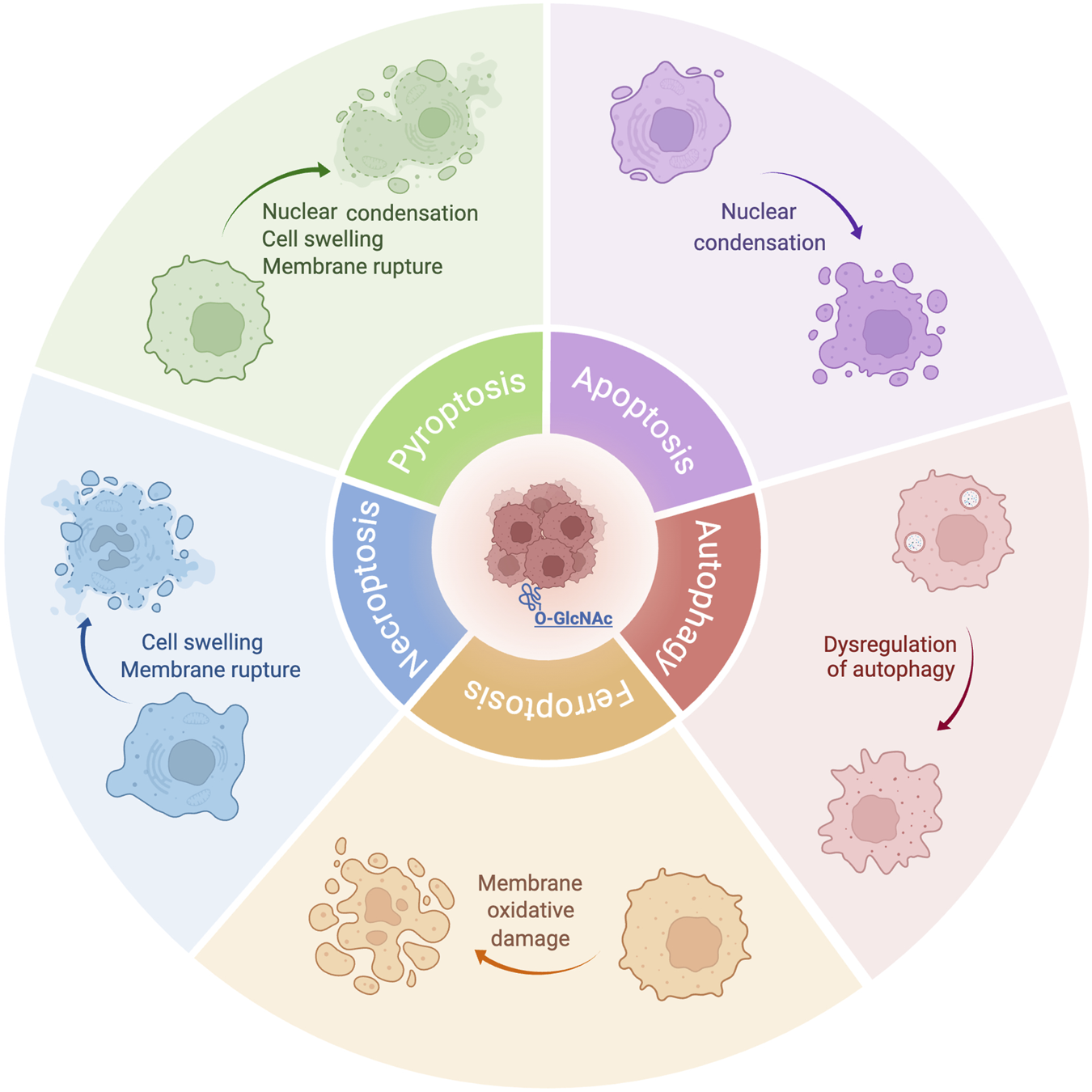 O-GlcNAcylation-mediated five PCDs play a role in cancer. O-GlcNAcylation is an essential post-translational modification that plays a role in cancer by adding O-GlcNAc to numerous proteins’ serine or threonine residues affecting PCD in cancer cells including apoptosis, autophagy, ferroptosis, necroptosis and pyroptosis.