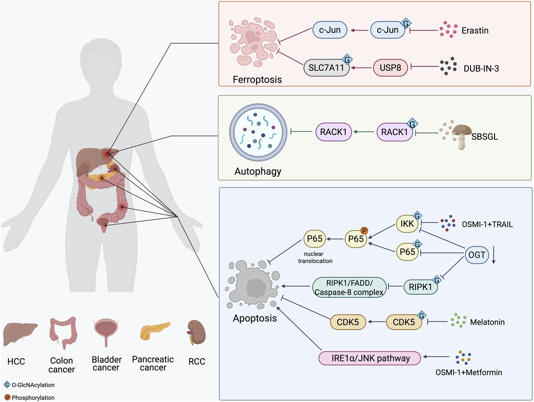 The strategy of O-GlcNAcylation in the treatment of in different cancers. The O-GlcNAcylation of proteins plays a crucial role in cancer development by affecting apoptosis, autophagy and ferroptosis. Small molecule inhibitors of OGT and OGA, several natural and synthetic compounds, or targeting OGT may provide a novel approach to cancer treatment.