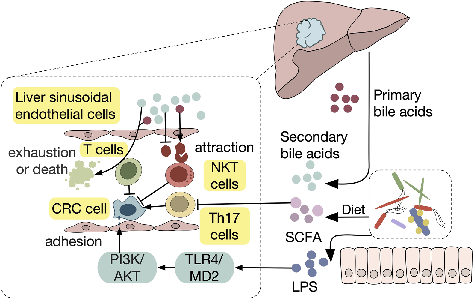 Gut microbiota-derived signals driving liver TME The influence of gut microbiota-derived metabolites on liver metastasis through the gut-liver axis is illustrated. Key interactions include microbial metabolites, such as LPS, engaging the TLR4/MD2 receptor complex, which activates the PI3K/AKT signaling pathway, facilitating CRC cell adhesion to liver sinusoidal endothelial cells. Concurrently, altered bile acid metabolism modulates NKT cell recruitment and T cell activity in the hepatic microenvironment, either promoting or suppressing metastatic progression. SCFAs, produced by commensal bacteria, can influence Th17 cell differentiation and enhance immune responses.