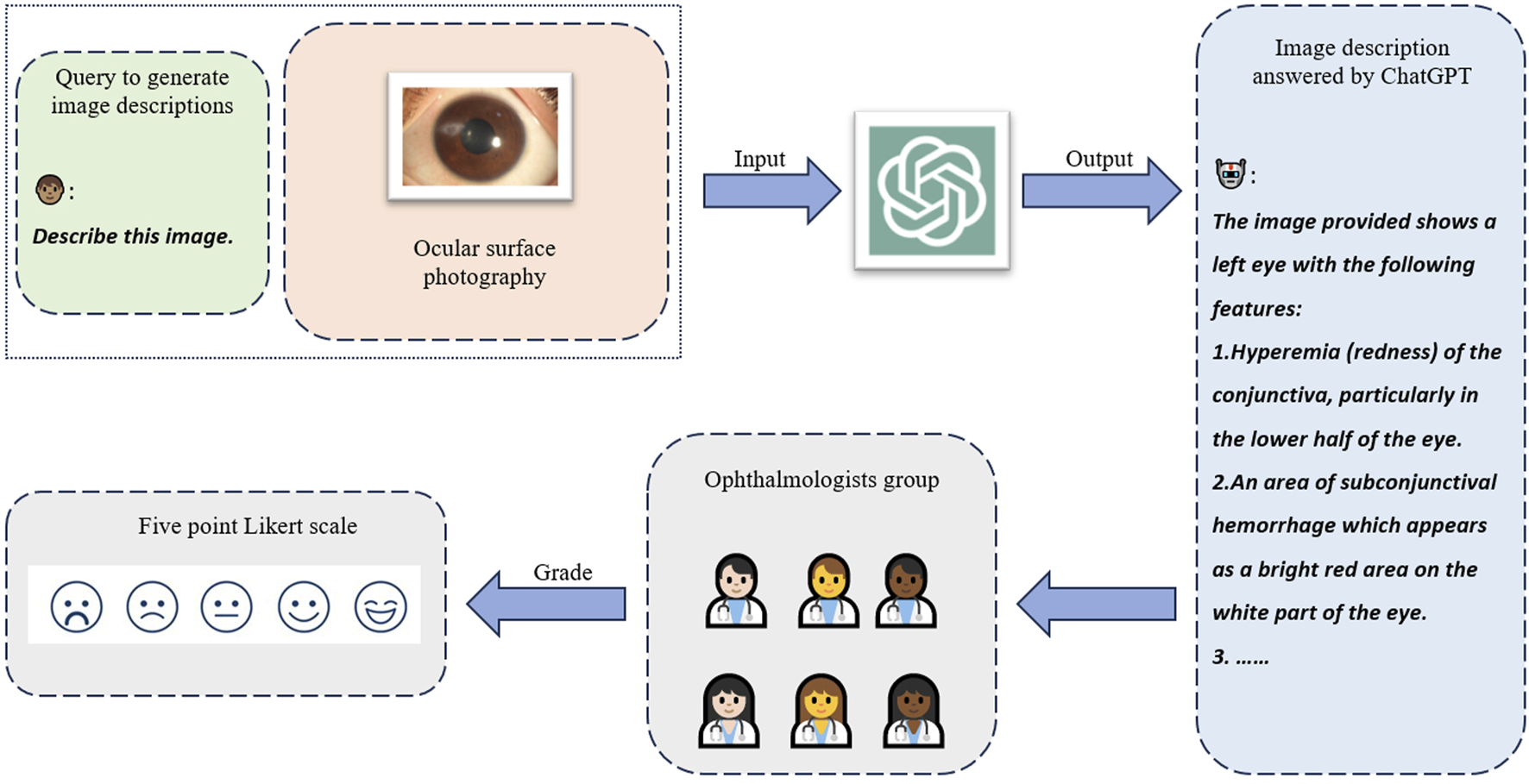 Human ophthalmologists assessing the image understanding capability of ChatGPT. ChatGPT was instructed to describe the input image in detail. The generated descriptions were delivered to six ophthalmologists to independently assess the quality in correctness and completeness with the five-point Likert scale.