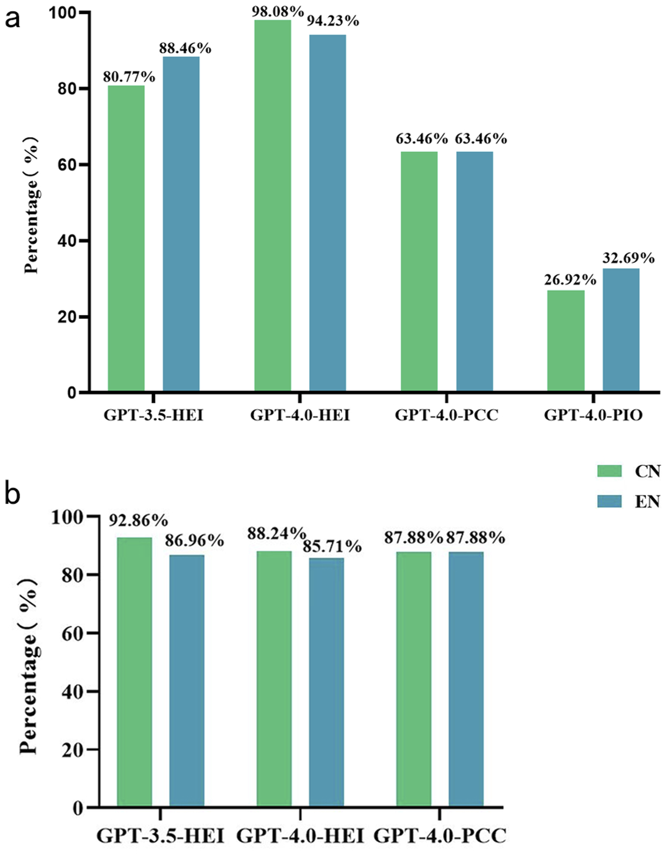 The performance of ChatGPT in diagnosing and providing treatment suggestions for ocular trauma with different data models. (a) Diagnostic accuracy of GPT-3.5 turbo and GPT-4.0 turbo in Chinese and English with different input models. (b) Accuracy of determining the need for surgical treatment (only for patients with a correct ChatGPT diagnosis). CN Chinese, EN English, HEI medical history and chief complaint with eye examination information, PCC photograph with medical history and chief complaint, PIO photography instruct only, GPT Generative Pre-trained Transformer.