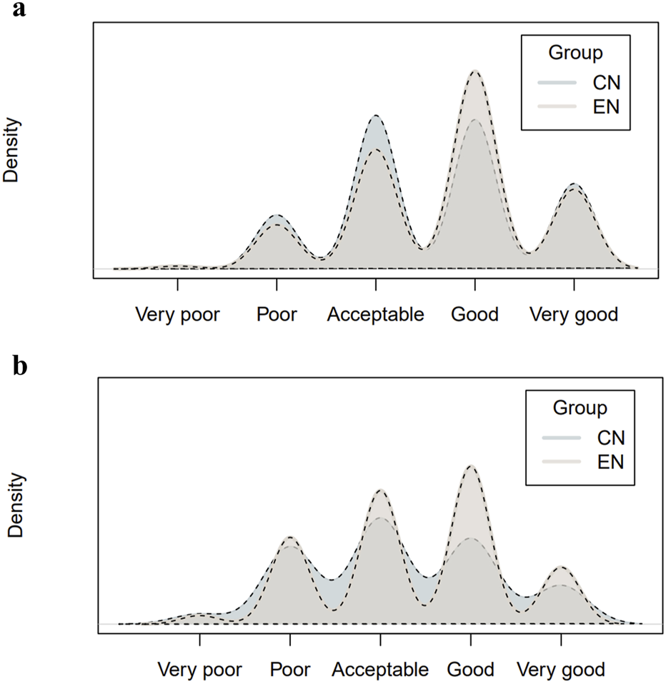 Statistical analyses were performed using R statistical software version 4.0.2. Continuous variables were presented as mean (standard deviation), while categorical data were reported as absolute frequencies (number, N) and percentages. The Wilcoxon test was used to compare continuous data, and the chi-square test was used for categorical data comparisons. Statistical significance was a two-sided p-value less than or equal to 0.05. To demonstrate the distribution and consistency of the Likert scales in two languages, we adopted the kernel density plots to visualize the results.
