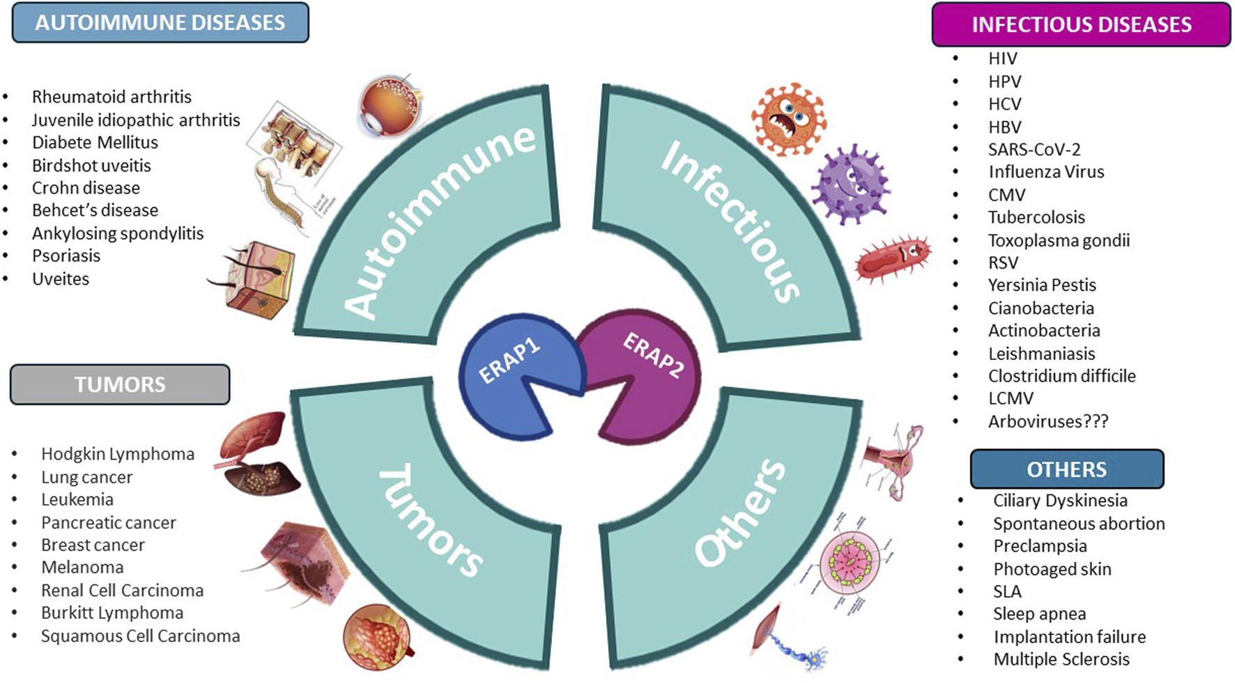 Figure 1. Human diseases correlated to variants and dysregulation of ERAP1 and ERAP2. Figure created with BioRender.com.