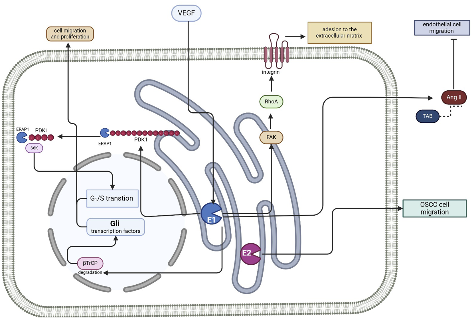 Figure 2. Schematic representation illustrating the multifaceted roles of ERAP1 and ERAP2 in cellular migration, angiogenesis, and metastasis formation. AngII: angiotensin II; βTrCP: F-box/WD repeat-containing protein 1A; E1: ERAP1; E2: ERAP2; FAK: focal adhesion kinase; OSCC: oral cavity squamous cell carcinoma; PDK1: pyruvate dehydrogenase kinase 1; RhoA: Ras homolog family member A; VEGF: vascular endothelial growth factor; S6K: S6 kinase; Figure created with BioRender.com.