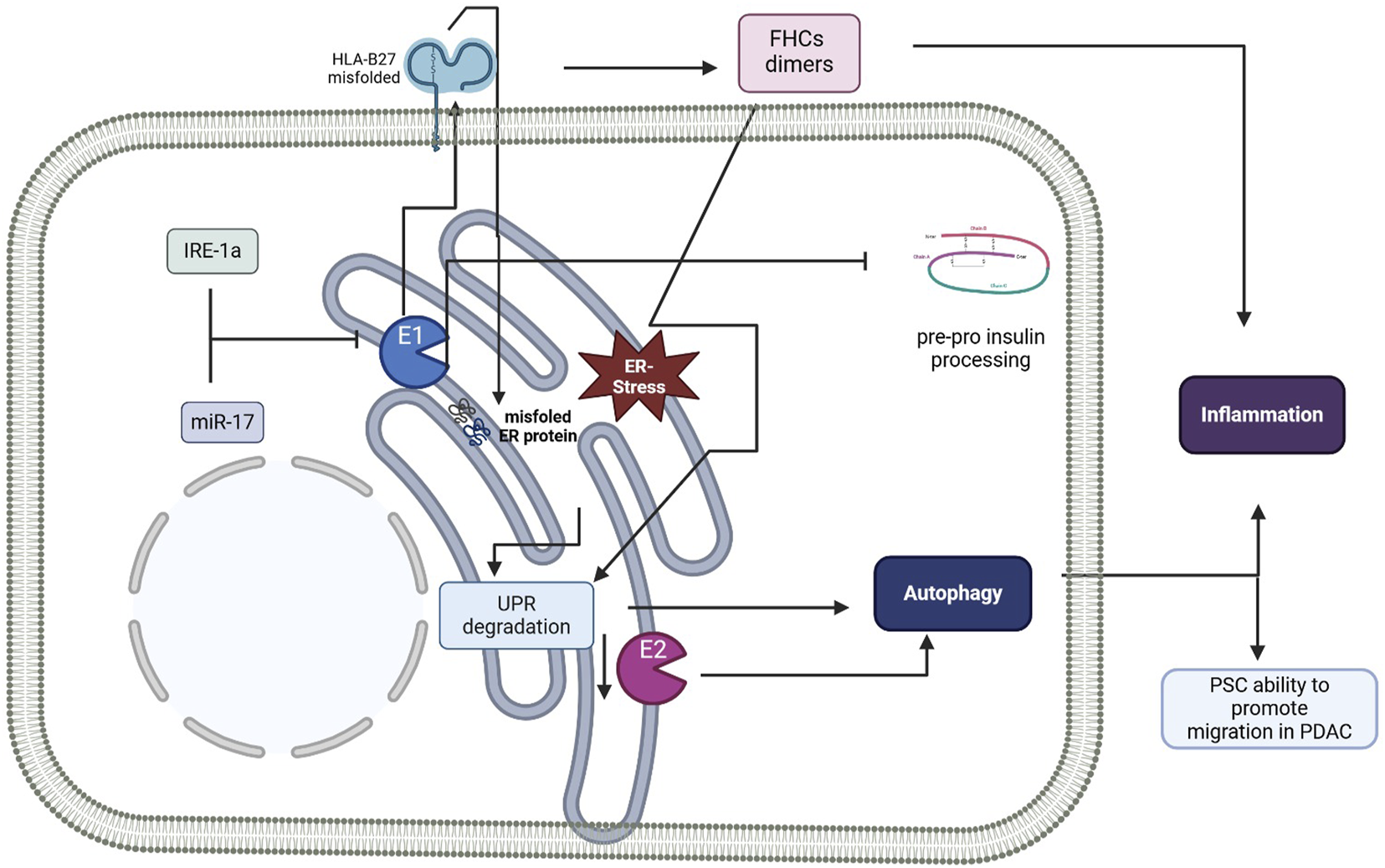 Figure 3. Schematic representation summarizing the role of ERAPs in the unfolded protein response (UPR) and autophagy. E1, ERAP1; E2, ERAP2; ER, endoplasmic reticulum; HLA-B27, human leucocyte antigen-B27; FHC, free heavy chain; IRE-1a, serine/threonine-protein kinase/endoribonuclease inositol-requiring enzyme 1 α; PSC, pancreatic stellate cell; PDAC, pancreatic ductal adenocarcinoma; UPR, unfolded protein response. Figure created with BioRender.com.