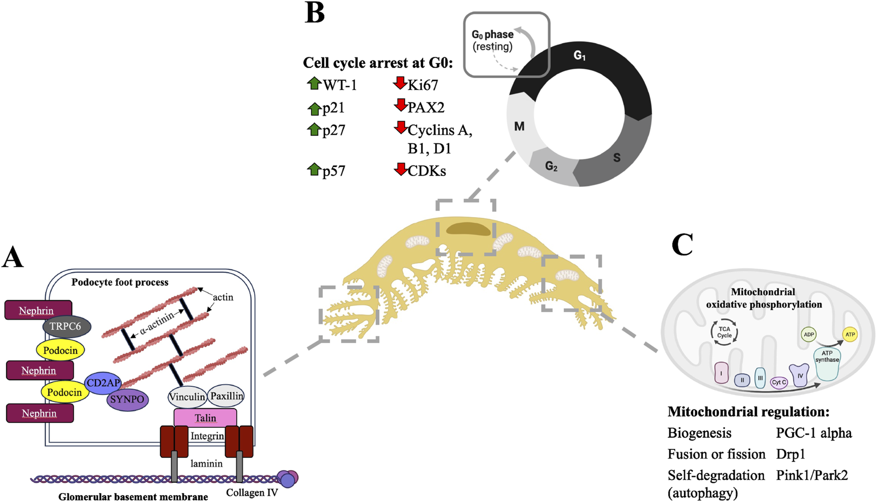 Podocytes are postmitotic cells comprised of a highly organized actin cytoskeleton, and these two cellular properties are supported by mitochondrial processes. (A) Podocyte foot processes are comprised of parallel actin filaments which are anchored to the cell membrane and to the underlying glomerular basement membrane by various actin-binding and actin-associated proteins (A) adapted from Lasagni et al., 2013; Curr Mol Med). (B) Podocytes undergo cell cycle arrest at the G0 resting phase. Within the nucleus, this terminally differentiated state is maintained through increased expression of cell cycle checkpoint proteins such as cyclin dependent kinase inhibitors and simultaneous decreased expression of proteins that promote cell cycle entry and proliferation. (C) The podocyte metabolic demands are largely due to the maintenance of their highly organized cellular structure and terminally differentiated state. Podocyte mitochondria have several adaptations to meet dynamic changes in metabolic demands, including biogenesis, fusion and fission to increase mitochondrial numbers and self-degradation through autophagy to remove damaged mitochondria and prevent excessive oxidative stress.