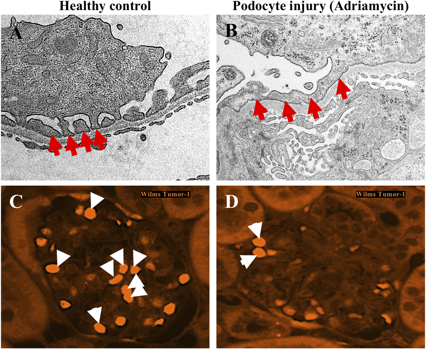 Podocyte foot process effacement and podocyte loss resulting from adriamycin injury. (A,B) Transmission electron microscopy images of podocytes from a healthy mouse glomerulus shows normal podocyte foot process morphology, characterized as interdigitating finger-like projections (red arrows) from the cytoplasm of podocytes which are in direct contact with the underlying glomerular basement membrane (A). In mice with podocyte injury due to adriamycin, the characteristic interdigitating pattern of podocyte foot processes is lost (red arrows), and instead are observed as a continuous, flattened structure lining the glomerular basement membrane. (C,D) Immunofluorescence staining for podocyte nuclear marker Wilms Tumour-1 (WT-1) demonstrates decreased number of podocytes (white arrows) in adriamycin-injured mice (D) compared to healthy controls (C).