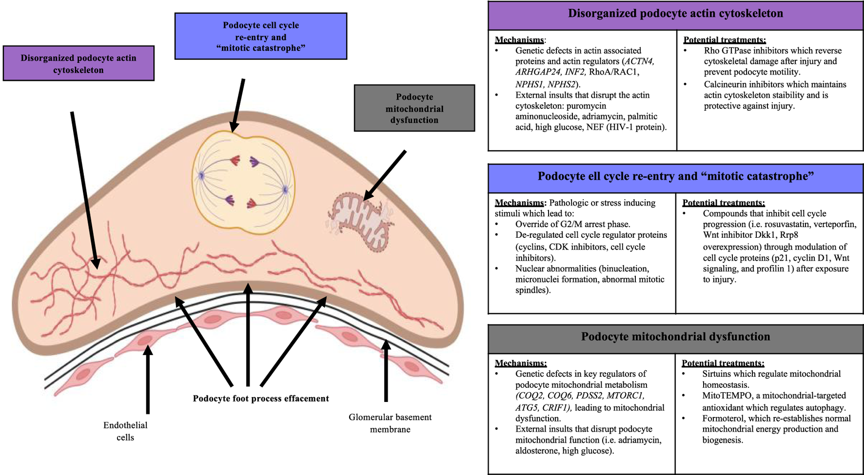 Mechanisms of podocyte loss and potential treatments. Disorganization of the podocyte actin cytoskeleton, cell cycle re-entry and mitotic catastrophe, and mitochondrial dysfunction are three cellular mechanisms that underlie podocyte loss. These mechanisms are also modifiable by potential treatments that can modulate the severity of podocyte injury.