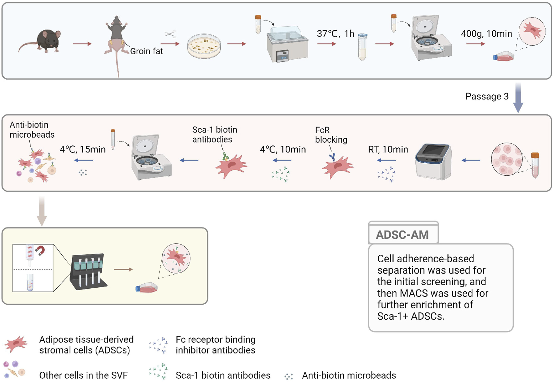 The pattern diagram displaying the ADSC-AM procedure. After isolating the SVF, the cells were cultured to MSCs to gain a growth advantage through media exchange and passaging. Sca-1 positive selection was then performed on third-generation ADSCs using biotin-conjugated Sca-1 antibodies and anti-biotin magnetic beads under a magnetic field (Created with BioRender.com).