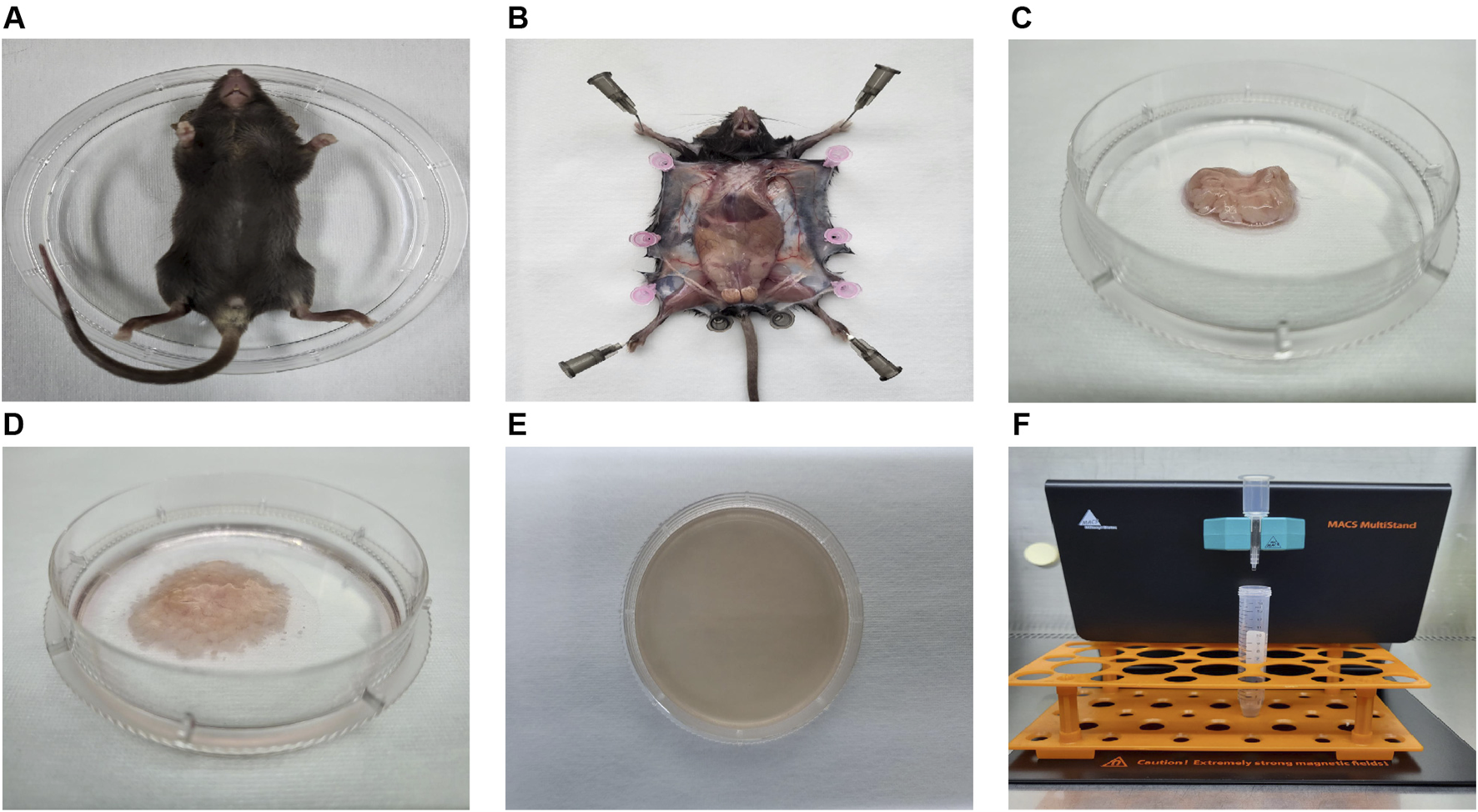 The process diagram illustrating the isolation of mouse ADSCs. (A) Mice were sacrificed via CO2 asphyxiation and placed in 100-mm sterile Petri dishes. (B) The skin was dissected to expose and isolate the inguinal fat pad. (C) The inguinal fat pad was collected and transferred to a 60-mm sterile Petri dish. (D) Impurities, including lymph nodes, fascia, and blood, were meticulously removed. The adipose tissue was then washed at least three times and finely minced with sterile microscissors. (E) Collagenase solution was added to the dish for enzymatic digestion. After digestion, the tissue was gently pipetted until fully liquefied. (F) The resulting SVF cells were incubated with magnetic beads and antibodies, followed by Sca-1 positive selection using a magnetic cell sorter.