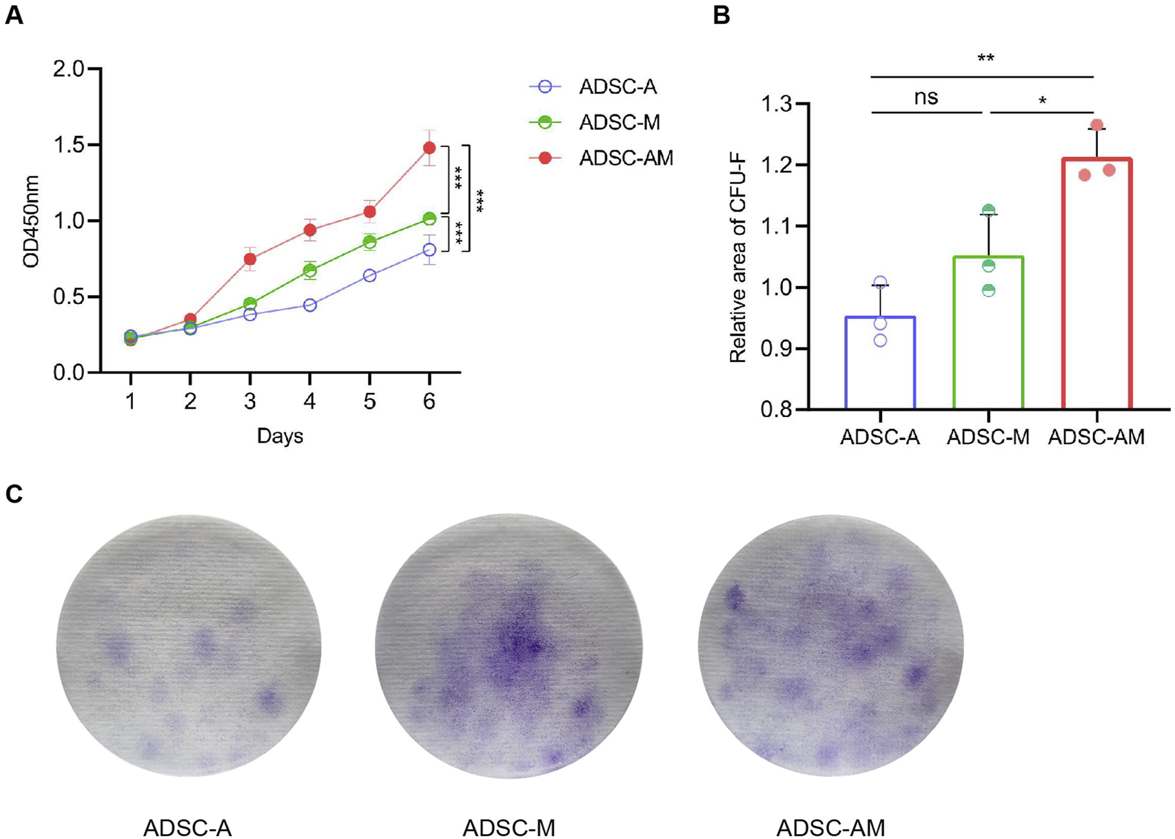 To evaluate the proliferative activity of mouse ADSCs obtained by the three methods, we employed the cell counting kit-8 (CCK-8) assay to assess the proliferation of the third generation of ADSC-A, ADSC-M, and ADSC-AM over 6 days (Figure 4A). The results indicated that ADSC-AM appeared to grow faster than ADSC-A and ADSC-M. ADSC-A exhibited the slowest growth, suggesting significant cellular aging. Additionally, we measured the proliferative activity of the third generation of ADSC-A, ADSC-M, and ADSC-AM using the colony-forming unit fibroblast (CFU-F) assay after 14 days (Figures 4B,C), which corroborated the CCK-8 results. After 14 days of inoculation and culture at the same density, ADSC-AM exhibited significantly higher proliferation activity compared to the other two groups, with the highest colony density and number. Therefore, the results demonstrate that ADSC-AM possess stronger proliferative activity than both ADSC-A and ADSC-M.