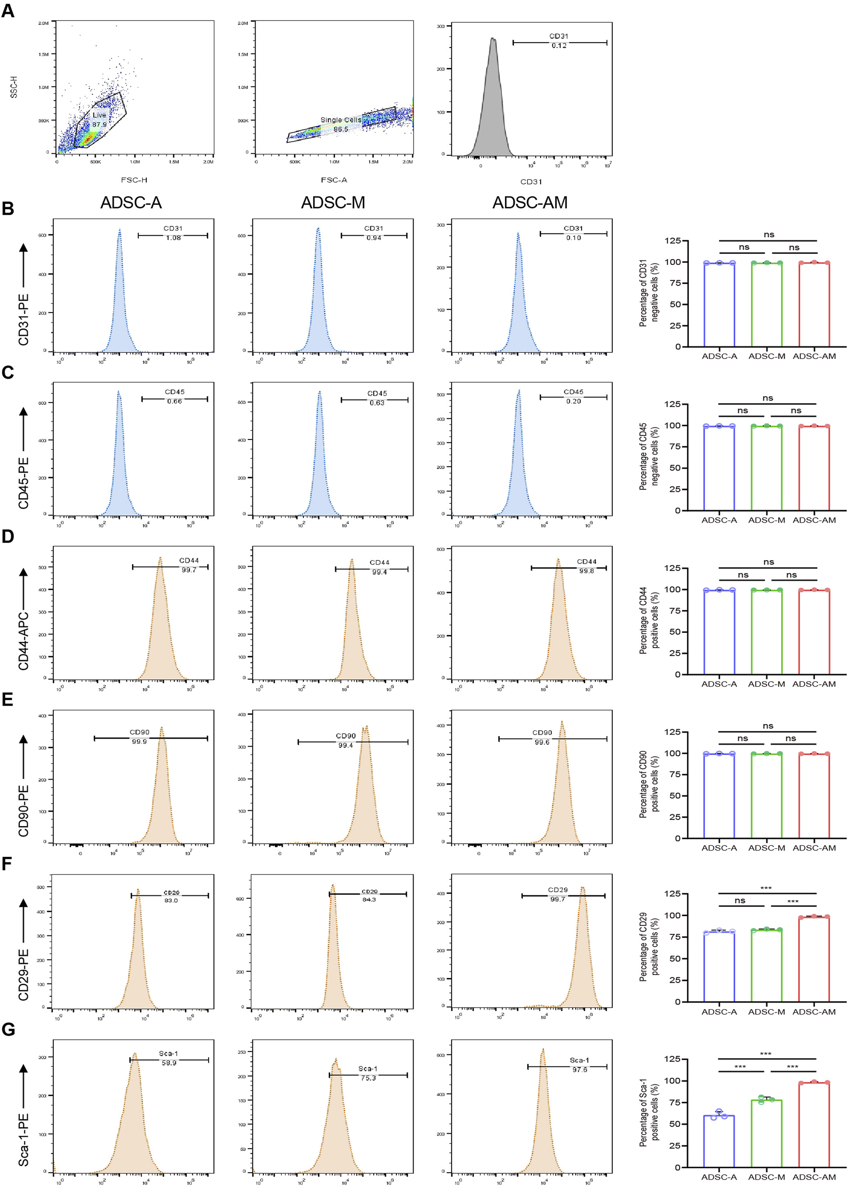 Surface antigen markers of mouse ADSCs obtained by three purification methods. (A) Logical gating strategy for all flow cytometry metrics (using CD31 as an example). (B–G) Expression levels of the negative cell markers CD31 (B) and CD45 (C), as well as the positive expression cell markers CD44 (D), CD90 (E), CD29 (F) and Sca-1 (G) in each group were detected (n = 3). Data were analyzed by one-way ANOVA and expressed as mean ± SEM. ns, not significant; *P < 0.05, **P < 0.01, ***P < 0.001.