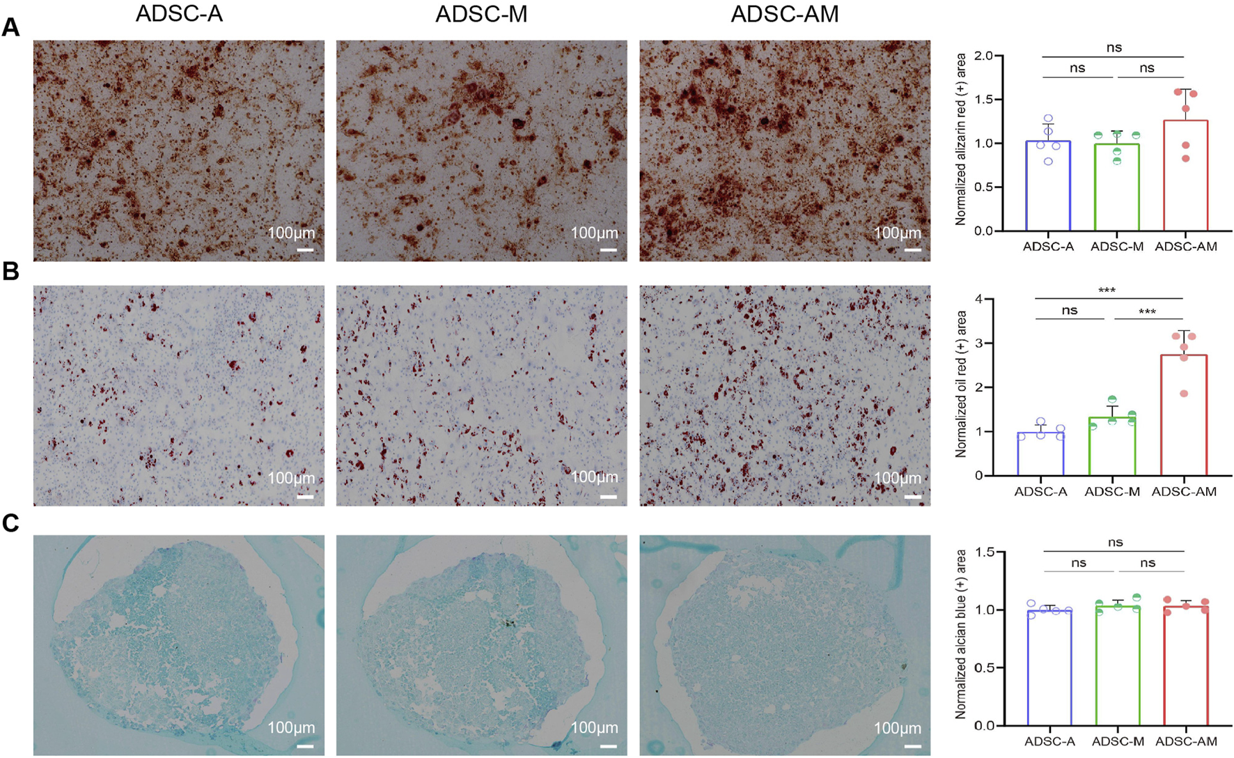 To assess the trilineage differentiation potential of the third-passage mouse ADSCs, we performed osteogenic, adipogenic, and chondrogenic differentiation assays. All groups demonstrated successful osteogenesis (Alizarin red staining), adipogenesis (Oil Red O staining), and chondrogenesis (Alcian blue staining) (Figures 6A–C). Notably, while there was no significant difference in the positive areas for calcium nodules and mucopolysaccharides among the three groups, ADSC-AM exhibited a larger positive area for lipid droplets during adipogenic differentiation compared to both ADSC-A and ADSC-M. In short, while all three mouse ADSC types can differentiate into osteoblasts, adipocytes, and chondrocytes, ADSC-AM show superior adipogenic differentiation ability.