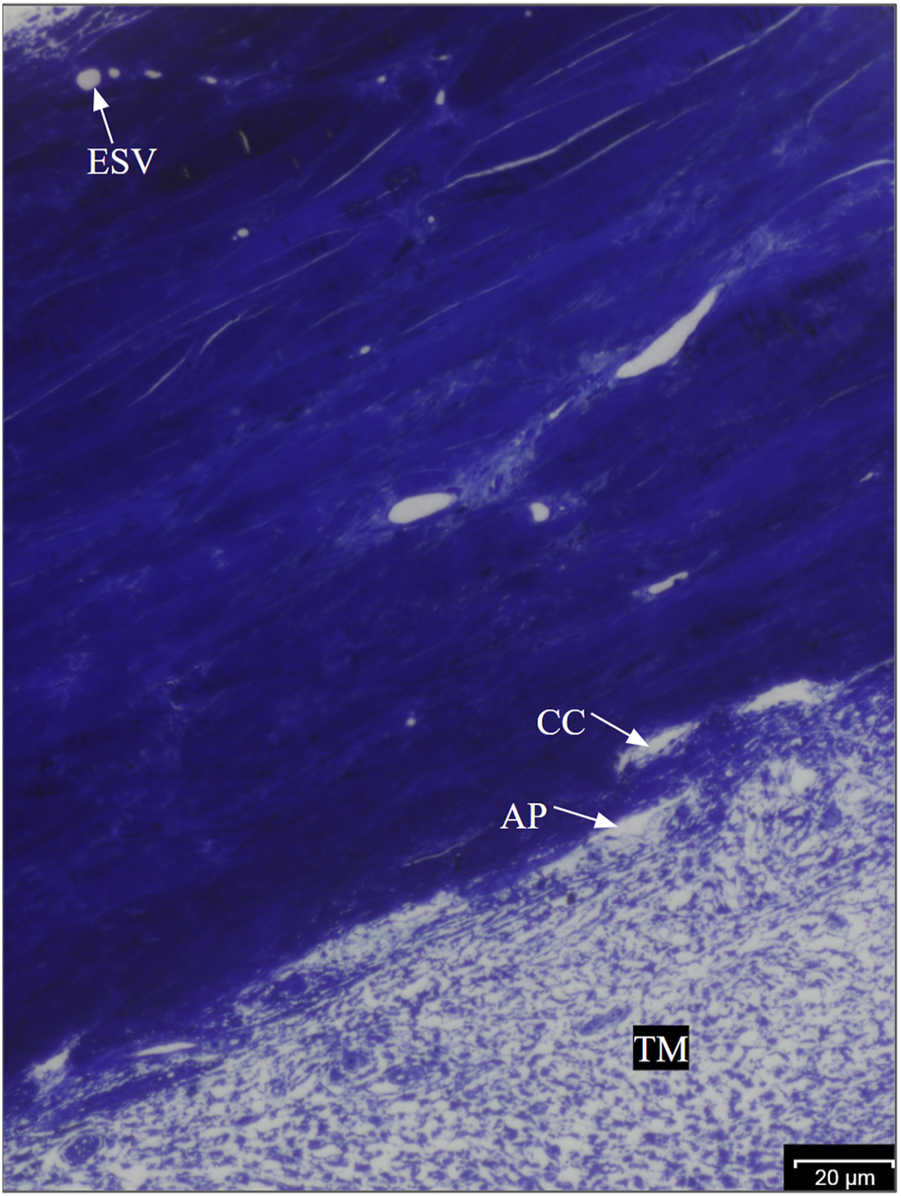 Anatomy of the bovine trabecular outflow pathway. Aqueous humor flows sequentially through the TM, trabecular meshwork; AP, aqueous plexus; CCs, collector channels; and ESVs, episcleral veins in bovine eyes.