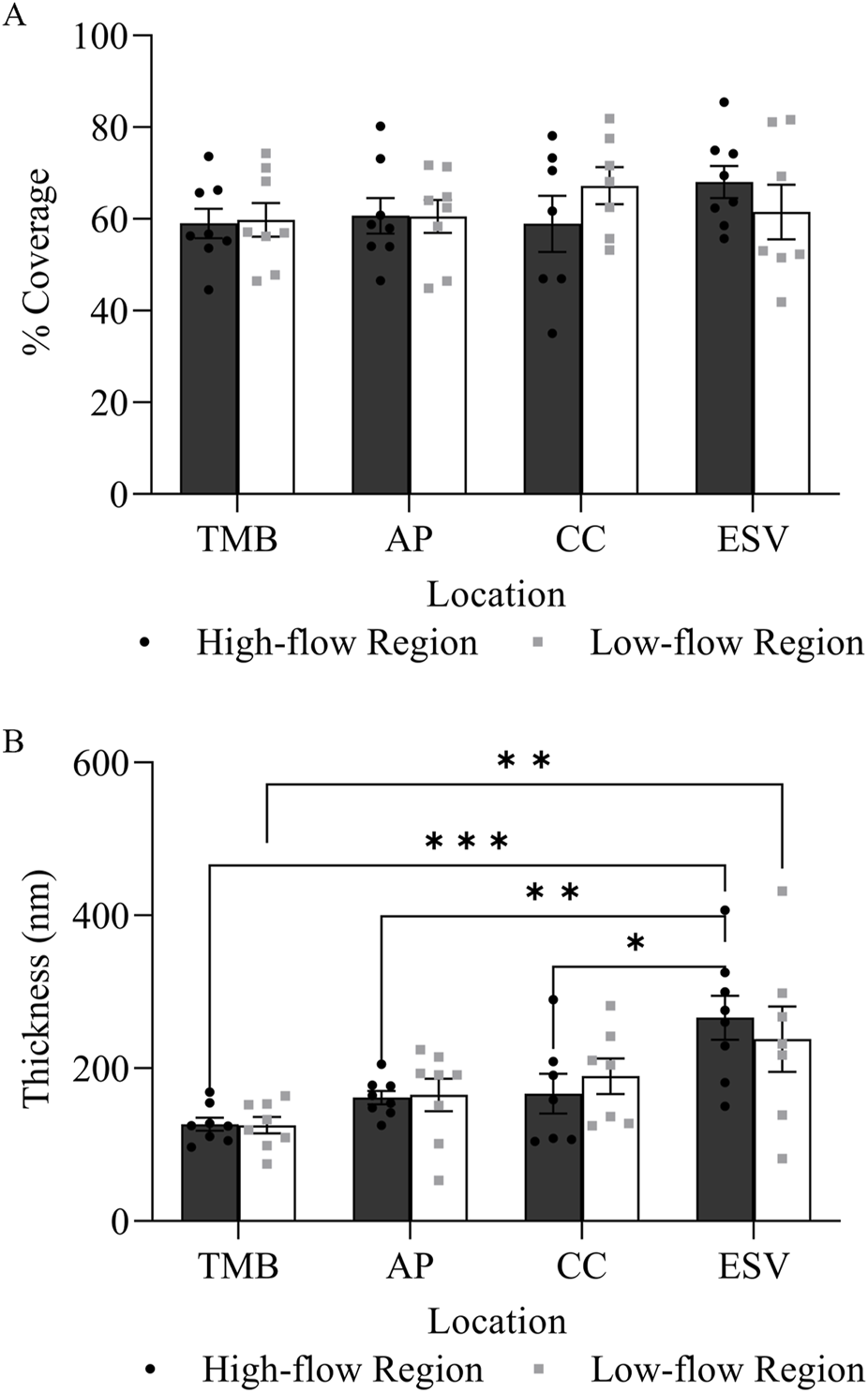 Glycocalyx distribution and thickness in high-flow and low-flow regions along the trabecular outflow pathway. (A) There was no significant difference in the percentage coverage of glycocalyx between flow regions at each outflow pathway location. (B) There was no significant difference in glycocalyx thickness between the high-flow and low-flow regions at each outflow pathway location. However, there was a significant progressive increase in glycocalyx thickness from the proximal (TMB) to distal (ESV) outflow pathway in both high-flow and low-flow regions.
