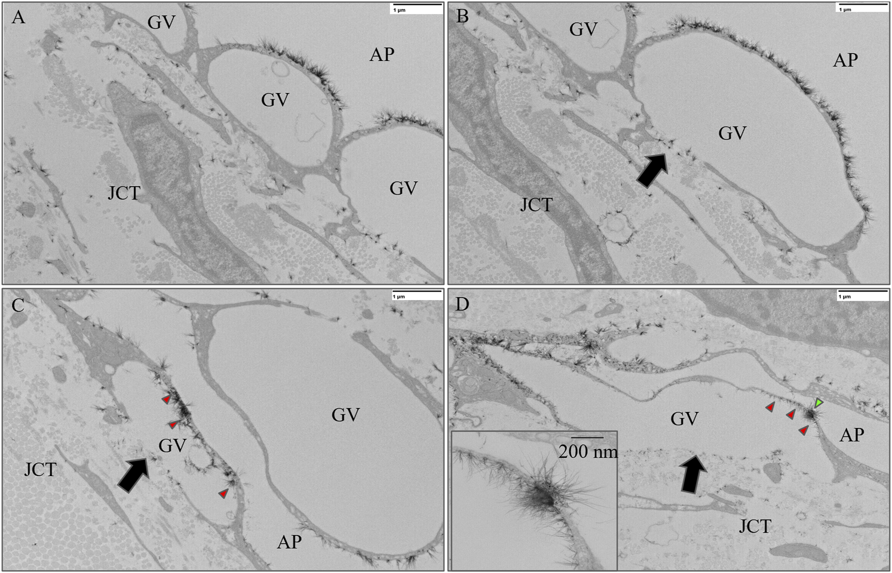 Representative images of giant vacuoles (GVs) with and without glycocalyx lining the inner cellular membrane. (A) A GV without a basal opening or I-pore and (B) a GV with a basal opening (black arrow) but no I-pore and no glycocalyx lining the inner cellular membrane. (C) A GV with a basal opening (black arrow) but without an I-pore with glycocalyx (red arrowheads) lining the inner cellular membrane. (D) A GV with an I-pore (green arrowhead) and a basal opening (black arrow), as well as with glycocalyx lining the inner cell membrane (red arrowheads). GV, Giant Vacuole; AP, Aqueous Plexus; JCT, Juxtacanalicular Tissue.