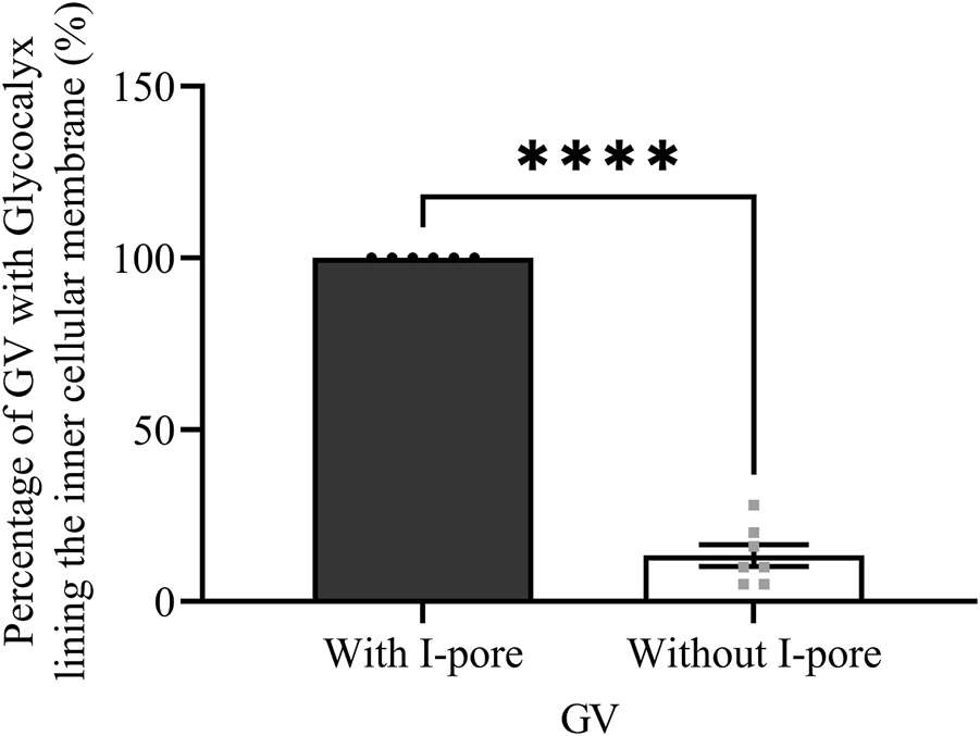 The percentage of GVs with and without I-pores with glycocalyx lining the inner cellular membrane. A significantly higher percentage of GVs (100%) with I-pores displayed glycocalyx lining the inner cellular membrane compared to GVs without I-pores (16%).