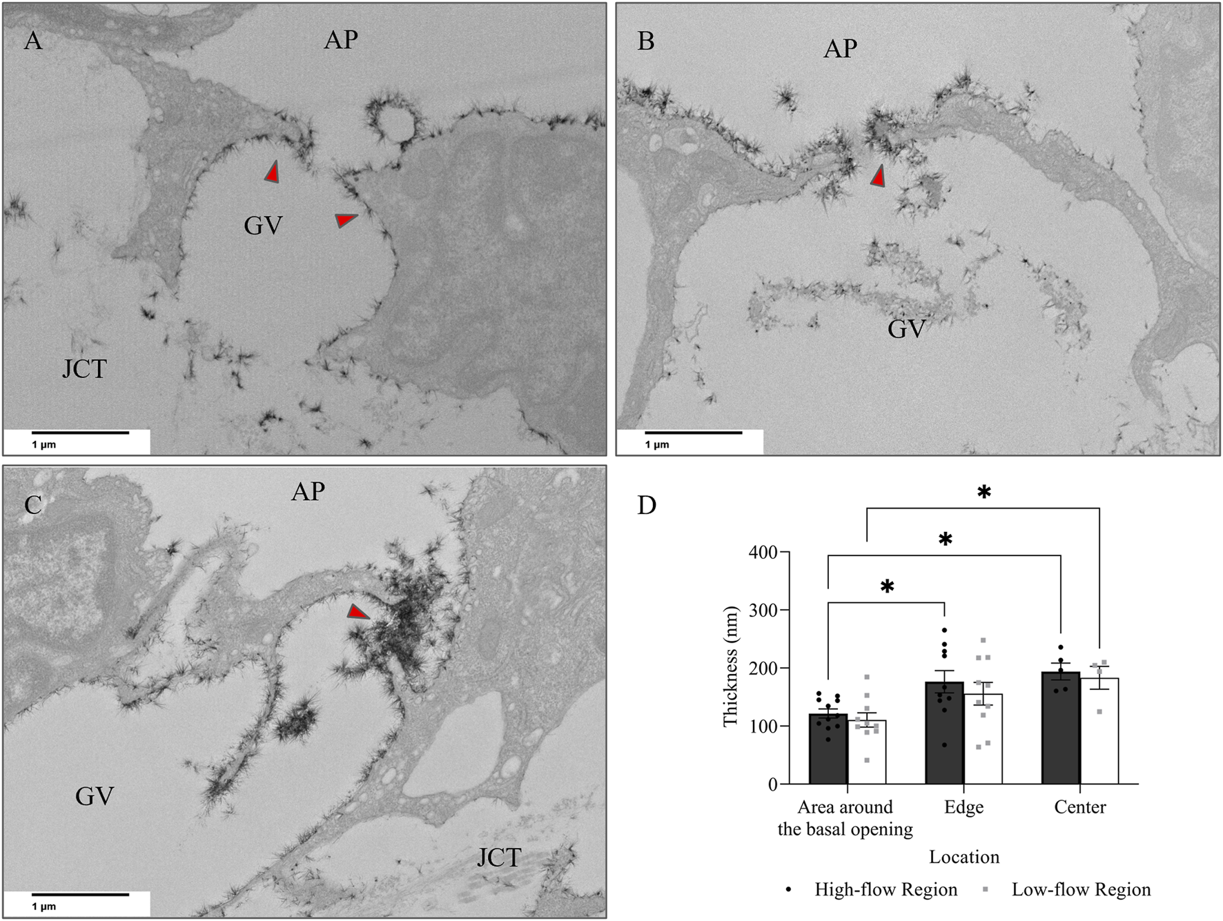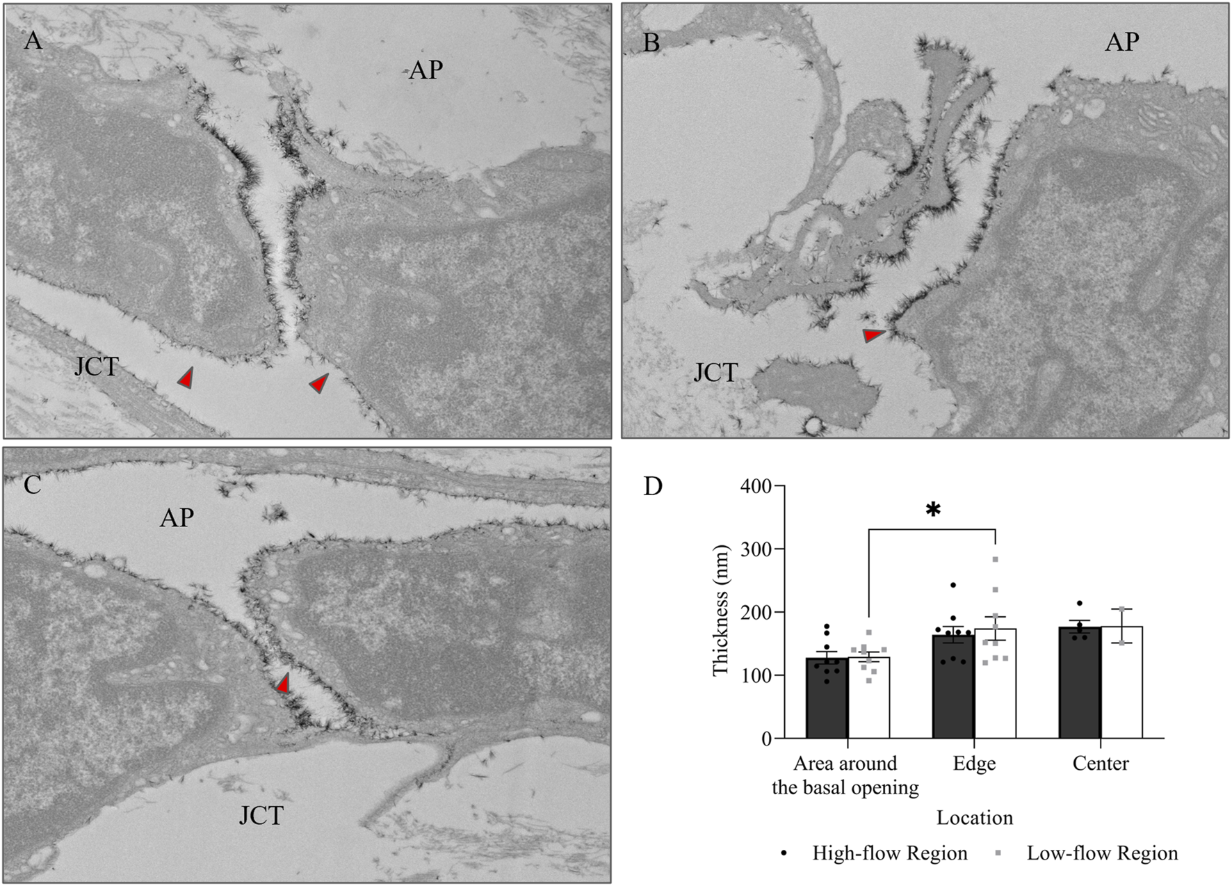 Glycocalyx thickness along B-pores. Representative images of glycocalyx (red arrow) lining: (A) around the basal opening, (B) along the edge, and (C) in the center of B-pores. (D) No significant difference in glycocalyx thickness was found between flow regions. However, the thickness increased from the area around the basal opening to the edge of the B-pores in the low-flow region. AP, Aqueous Plexus; JCT, Juxtacanalicular Tissue.