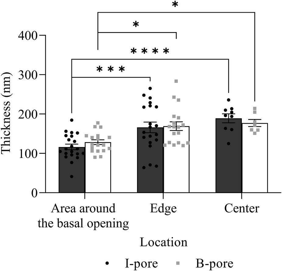 Glycocalyx thickness along both I- and B-pores. The glycocalyx thickness increased from the area around the basal opening to the center of both I- and B-pores. However, no significant differences were observed between the two types of pores at any locations.