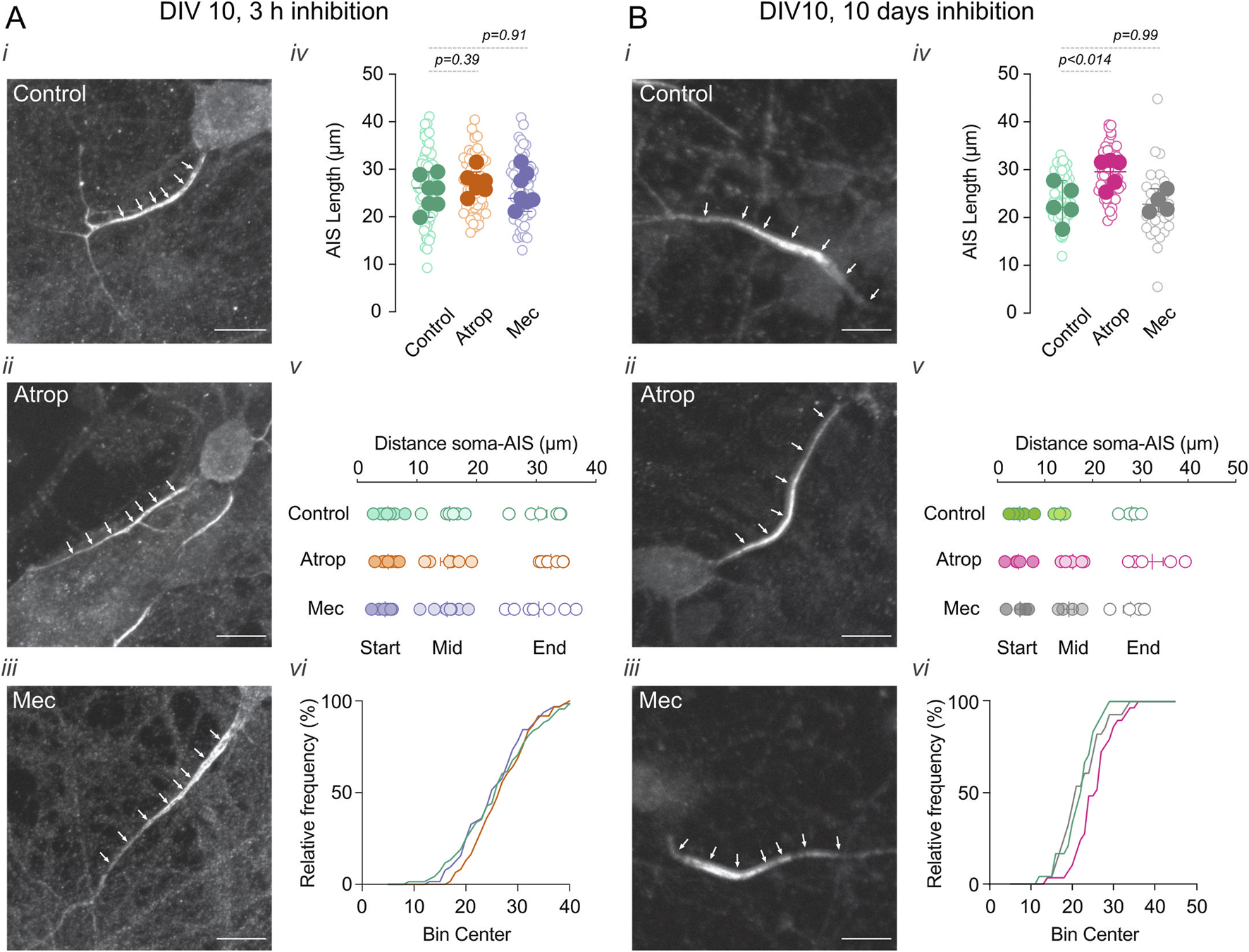 Chronic inhibition of muscarinic transmission increases AIS length. Effect of 3 h (A) and 0–10 DIV (B) incubation with cholinergic receptor inhibitors atropine or mecamylamine in the AIS length and position. Neurons were immunolabeled for Ankyrin G (white arrowheads), a marker for the AIS. In each panel (A,B) (i) shows a representative image of neurons in control, (ii) 10 µM atropine, and (iii) 10 µM mecamylamine treatment. (iv) Shows the summary plots of AIS length with the different treatments (open circle indicates individual cells, closed circles indicate the average of the cells on independent cultures), (v) shows the summary plot of the distance of the soma-AIS, s, start; M, middle; E, end (circles represent the average of cells in each culture). (vi) Shows a representative frequency distribution of the AIS intensity signal. Scale bar = 10 µm. Statistical differences were tested using an unpaired Student’s t-test, p-values are showed above the graphs.