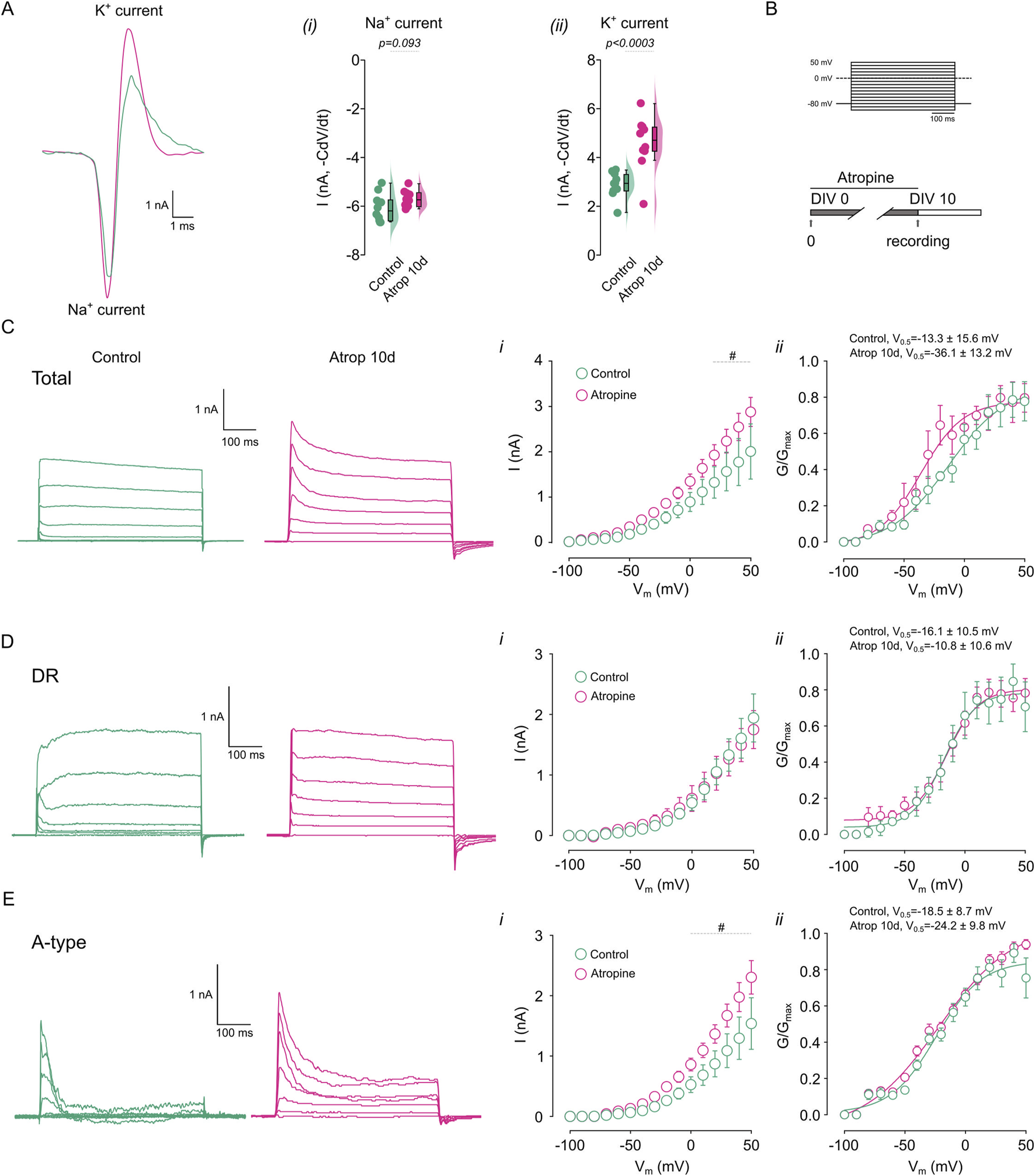 Chronic muscarinic inhibition increases K+ currents. The net ion current was calculated from the action potential waveform in cortical pyramidal neurons treated for 0–10 DIV with 10 µM atropine. (A) Shows the calculated ionic current underlying the action potential in the different treatments, right panels show the quantification of the (i) Na+ and (ii) K+ current. (B) Shows the voltage step protocol used for the current measurement. (C) Shows the representative traces of the total K+ current obtained in the presence of 0.5 µM TTx and measured in control and atropine treated neurons, right panels show the (i) I/V plot, (ii) the G/Gmax curve. (D) Shows the representative traces of the DR K+ current obtained in the presence of 0.5 µM TTx and 2 mM 4-AP and measured in control and atropine treated neurons, right panels show the (i) I/V plot, (ii) the G/Gmax curve. (E) Shows the representative traces of the 4-AP sensitive K+ current obtained by subtracting total K+ currents for DR K+ currents and measured in control and atropine treated neurons, right panels show the (i) I/V plot, (ii) the G/Gmax curve. Statistical differences for I/V plots were tested using two-way ANOVA, with a Šídák post hoc test. All other comparisons were tested using an unpaired Student’s t-test, p-values are showed above the graph. # indicates voltage were p < 0.05 in this comparison.