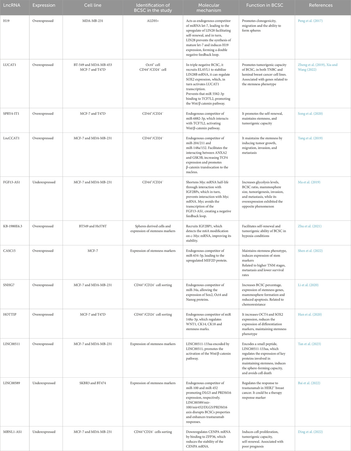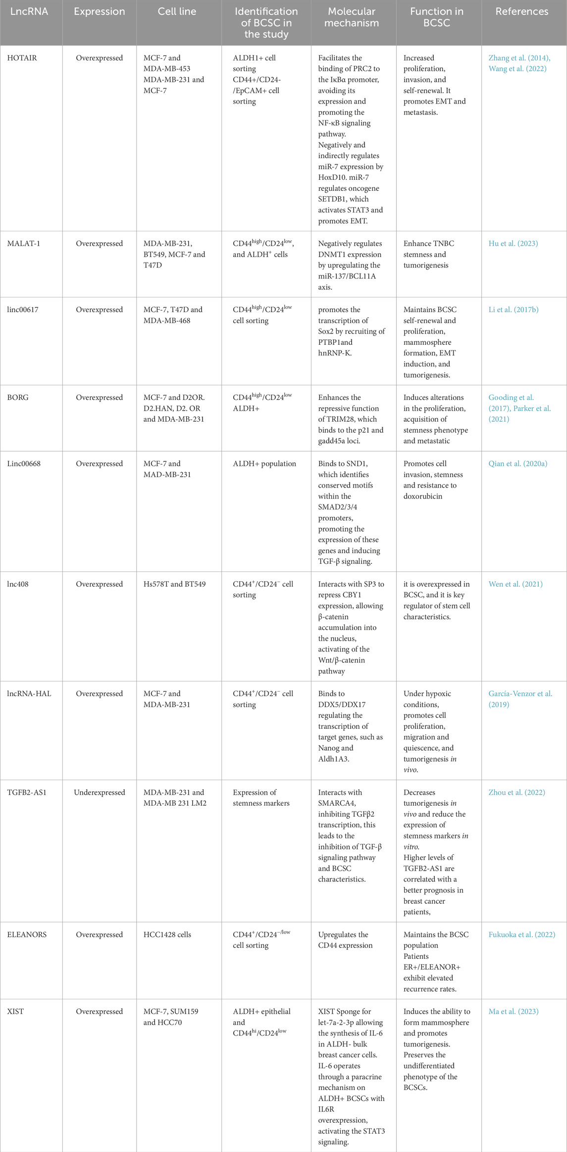 Currently, several lncRNAs associated with the regulation of the BCSC population or the acquisition of stemness have been identified. Interestingly, some of them can predict the prognosis of breast cancer patients and can be used as survival biomarkers (Qian et al., 2022). Several lncRNAs implicated in the regulation of CSCs have been extensively studied, such as HOTAIR and H19 (Peng et al., 2017; Brown et al., 2020; Wang et al., 2022).
