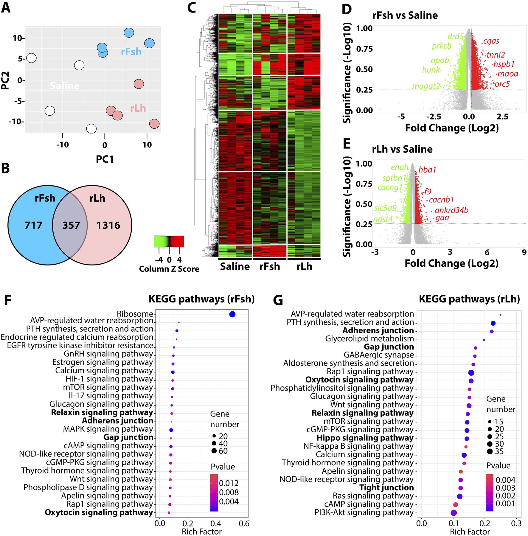 RNA-seq analysis of testis from Senegalese sole males treated with rFsh or Lh. (A) Principal component analysis (PCA) of the top 500 differentially expressed genes (DEGs) in testes from males treated with saline (control), rFsh or rLh (n = 4). (B) Venn diagrams showing the number of rFsh- and rLh-specific and common DEGs (in intersect region) with respect to the control group. (C) Heatmap generated by hierarchical clustering of RNA-seq expression z-scores computed for the 2390 DEGs (p-adj <0.01; Log2 fold change >0.5) between treatments. (D,E) Volcano plots of DEGs in the rFsh- (D) and rLh-treated (E) groups with respect to the control group. The x-axis shows Log2 fold changes in expression and the y-axis the negative logarithm of their p-value to base 10. Red and green dot mark the genes with significantly increased or decreased expression respectively (FDR <0.01). The most regulated transcripts in each case are indicated. (F,G) Canonical pathways related to DEG in the testis of rFsh- (F) and rLh-treated (G) males identified using the PANTHER classification system. The plot shows the 25 most highly enriched signaling pathways (FDR <0.05) in the testis, with the Rln, Oxt and cell-cell adhesion pathways highlighted in bold lettering. The X-axis shows the rich factor while the Y-axis shows the KEGG pathway. A high and low P-value is represented by blue and red, respectively.