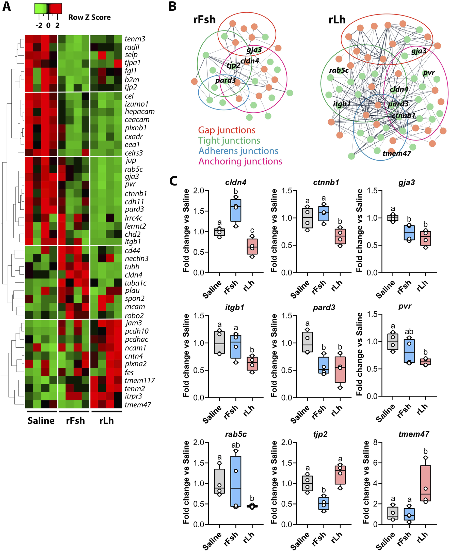 Gonadotropins regulate the expression of cell adhesion molecules. (A) Heatmap generated for the DEGs related to cell adhesion molecules (CAMs) as indicated by the PANTHER pathway: gap junctions, adherens junctions and tight junctions. (B) Representation of the protein-protein interaction (PPI) networks of DEGs related to CAMs specifically regulated by rFsh (left) or rLh (right). The different colored circles group the DEGs according to the type of junctions where the protein products are potentially located. Representative transcripts from each group are annotated. (C) Validation of the RNA-seq data by RT-qPCR for selected genes: claudin 4 (cldn4), catenin beta 1 (ctnnb1), gap junction protein alpha 3 (gja3), integrin subunit beta 1 (itgb1), par-3 family cell polarity regulator (pard3), poliovirus receptor (pvr), RAS oncogene family 5c (rab5c), tight junction protein 2 (tjp2), and transmembrane protein 42 (tmem42). Data are presented as box and whisker plots/scatter dots with horizontal line (inside box) indicating median and outliers (n = 4 fish, white dots), and were statistically analyzed by one-way ANOVA followed by the Tukey’s multiple comparison test. Bars with different superscripts are significantly different (P < 0.05).
