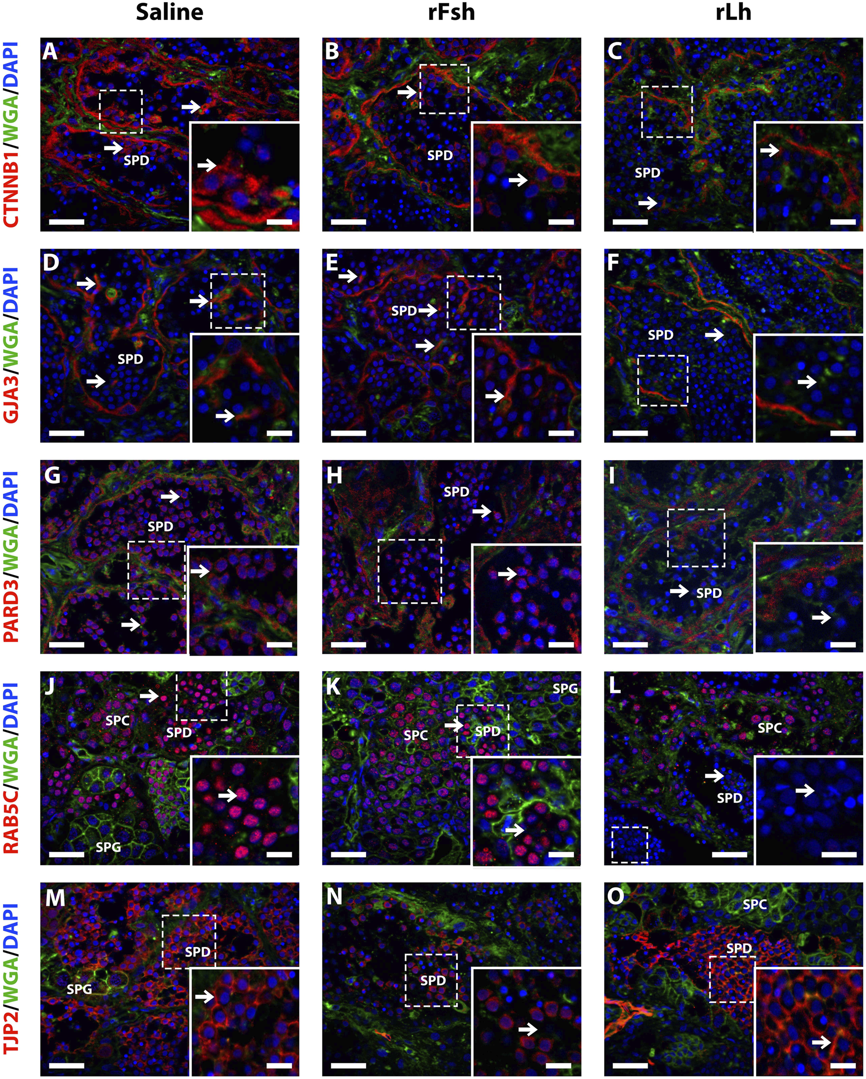 Immunolocalization of Ctnnb1, Gja3, Pard3, Rab5c and Tjp2 in the testis of Senegalese sole treated with saline, rFsh or rLh. The panels show representative immunofluorescence microscopy images of the localization Ctnnb1 (A–C), Gja3 (D–F), Pard3 (G–I), Rab5c (J–L) and Tjp2 (M–O) in the testis of males treated with saline (A, D, G, J, M), rFsh (B, E, H, K, N) or rLh (C, F, I, L, O) as indicated. Sections were labelled with commercial rabbit polyclonal antibodies specific for each protein and were visualized with a Cy3-conjugated sheep anti-rabbit (red) antibody. The cell nuclei were counterstained with 4′,6-diamidino-2-phenylindole (DAPI; blue), while the membranes and extracellular matrix were visualized with Alexa Fluor 647-conjugated wheat germ agglutinin (WGA, green). Scale bars, 30 µm. In each panel, the aera that was zoomed-in for the inset is indicated doted lines. The arrows in the insets point the cellular type where the expression of the protein appears to change with the treatment, i.e., Ctnnb1, Gja3 and Tjp2 (A–F) and (M–O) in Sertoli cells, and for Pard3 and Rab5c (G–L) in spermatids. Scale bars, 10 µm (in the inset, 3 µm). SPG, spermatogonia; SPC, spermatocyte; SPD, spermatid; SPZ, spermatozoa.