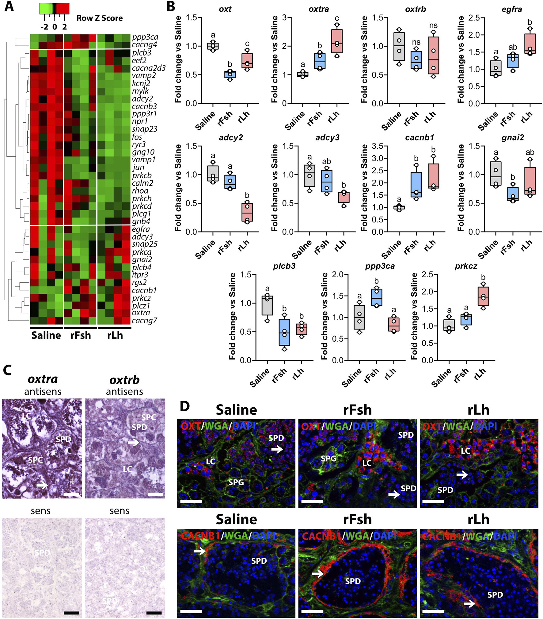 Gonadotropins regulate the oxytocin (Oxt) signalling pathway. (A) Heatmap of DEGs related to the Oxt signaling pathway in the rFsh- and rLh-treated groups. (B) Validation of the RNA-seq data by RT-qPCR for selected genes potentially involved in the pathway: oxytocin (oxt), oxytocin receptor a (oxtra), oxytocin receptor b (oxtrb), epidermal growth factor receptor a (egfra), adenylate cyclase 2 (adcy2), adenylate cyclase 3 (adcy3), calcium voltage-gated channel auxiliary subunit beta 1 (cacnb1), G protein subunit alpha I2 (gnai2), phospholipase C beta 3 (plcb3), protein phosphatase 3 catalytic subunit alpha (ppp3ca), and protein kinase C zeta (prkcz). Data are presented as box and whisker plots/scatter dots with horizontal line (inside box) indicating median and outliers (n = 4 fish, white dots), and were statistically analyzed by one-way ANOVA followed by the Tukey’s multiple comparison test. Bars with different superscripts are significantly different (P < 0.05). (C) Localization of oxtra (left) and oxtrb (right) transcripts in the sole testis by ISH. Paraffin sections were hybridized with antisense DIG-labeled riboprobes specific for each Oxt receptor (upper panels) as indicated. Control sections (lower panels) were hybridized with sense probes and were negative. Scale bars, 30 μm. (D) Immunolocalization of Oxt (upper panel) and Ctnnb1 (lower panel) in the testis of males exposed to different treatments using rabbit polyclonal antibodies specific for each protein (red). The nuclei were counterstained with DAPI (blue), while the membranes and extracellular matrix were visualized with WGA (green). Scale bars, 30 µm. In C and D, arrows point to Sertoli cells. Scale bars, 10 µm. SPG, spermatogonia; SPC, spermatocyte; SPD, spermatid; SPZ, spermatozoa, LC, Leydig cell.