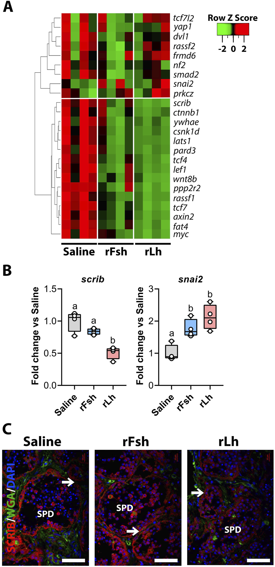 Gonadotropic regulation of the Hippo signaling pathway. (A) Heatmap of transcripts related to the Hippo signaling pathway differentially regulated by rFsh and rLh. (B) RT-qPCR analysis of transcripts potentially involved in the pathway, such as scribble planar cell polarity protein (scrib) and snail family transcriptional repressor 2 (snai2). Data are presented as box and whisker plots/scatter dots with horizontal line (inside box) indicating median and outliers (n = 4 fish, white dots), and were statistically analyzed by one-way ANOVA followed by the Tukey’s multiple comparison test. Bars with different superscript are significantly different (P < 0.05). (C) Immunolocalization of Scrib in the testis of males exposed to different treatments (red), using a rabbit polyclonal antibody specific for SCRIB. The nuclei were counterstained with DAPI (blue), while the membranes and extracellular matrix were visualized with WGA (green). The arrows point to Sertoli cells where the staining appears to be of lower intensity with the rLh treatment. Scale bars, 30 µm. SPD, spermatid.