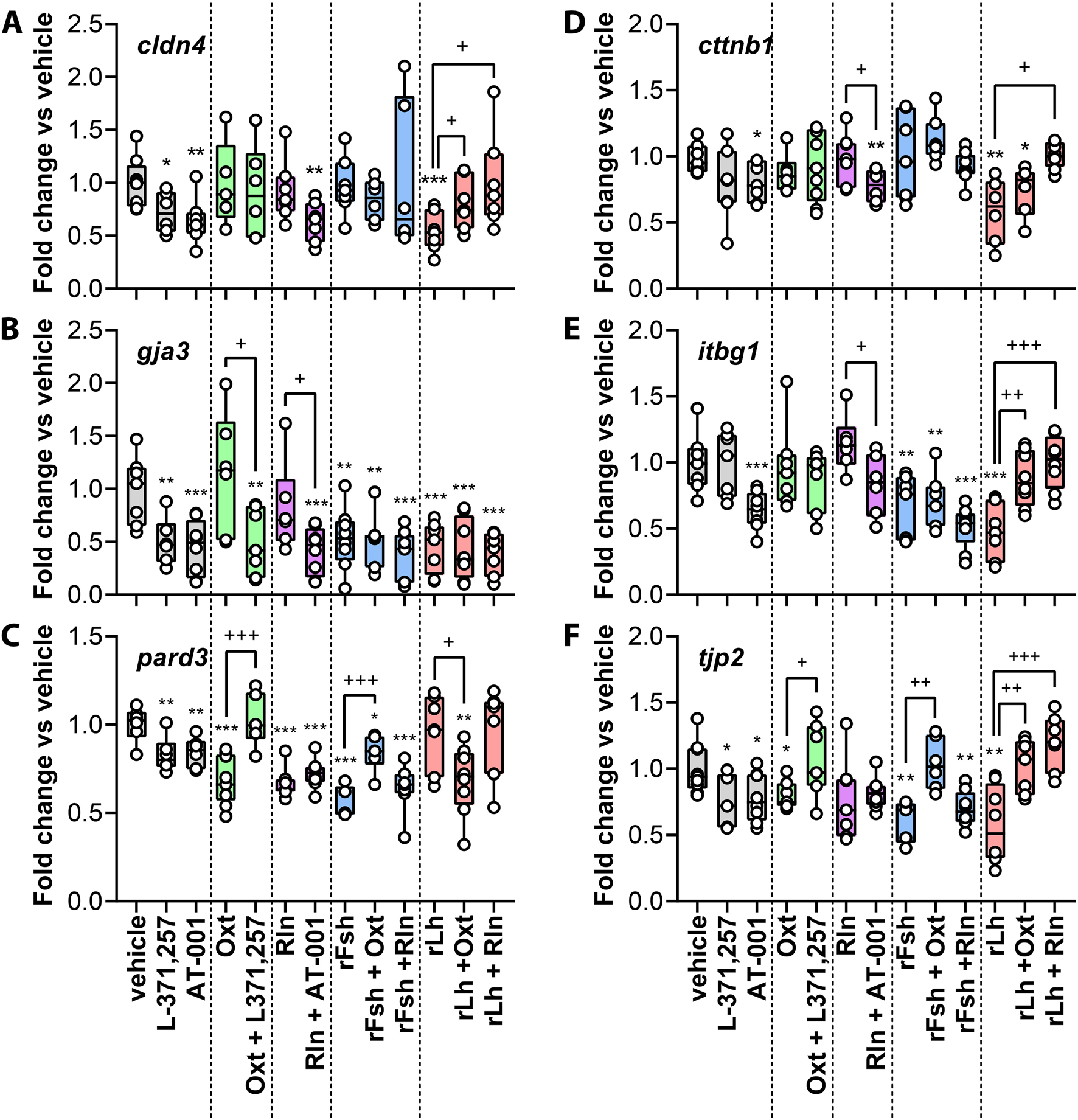 Effect of gonadotropins, Rln and Oxt, and pharmacological inhibition of their receptors, on the expression of testicular transcripts encoding CAMs in vitro. (A–F) Testicular explants were treated with 100 ng/mL rFsh, rLh Rln or Oxt, or with a combination of rFsh or rLh with Rln or Oxt, for 24 h. The negative control was only incubated with the vehicle (0.1% DMSO). Additional explants treated with vehicle, Rln or Oxt were incubated with 10 µM of Rln and Oxt receptor antagonists (AT-001 and L-371,257, respectively) for 1 h prior to stimulation with the corresponding peptide hormone. The expression of selected transcripts encoding for CAMs, indicated in each panel, was subsequently carried out by RT-qPCR. The values represent compiled data from three independent experiments using explants from different males, each with two replicates per treatment. The data are presented as box and whisker plots/scatter dots with horizontal line (inside box) indicating median and outliers (n = 4 fish, white dots), and were statistically analyzed by the two-tailed unpaired Student’s t-test, or by the nonparametric Mann Whitney test when variances were not equal. *, P < 0.05; **, P < 0.01; ***, P < 0.001, with respect to the control; +, P < 0.05; ++, P < 0.01, +++, P < 0.001, between groups as indicated by brackets.