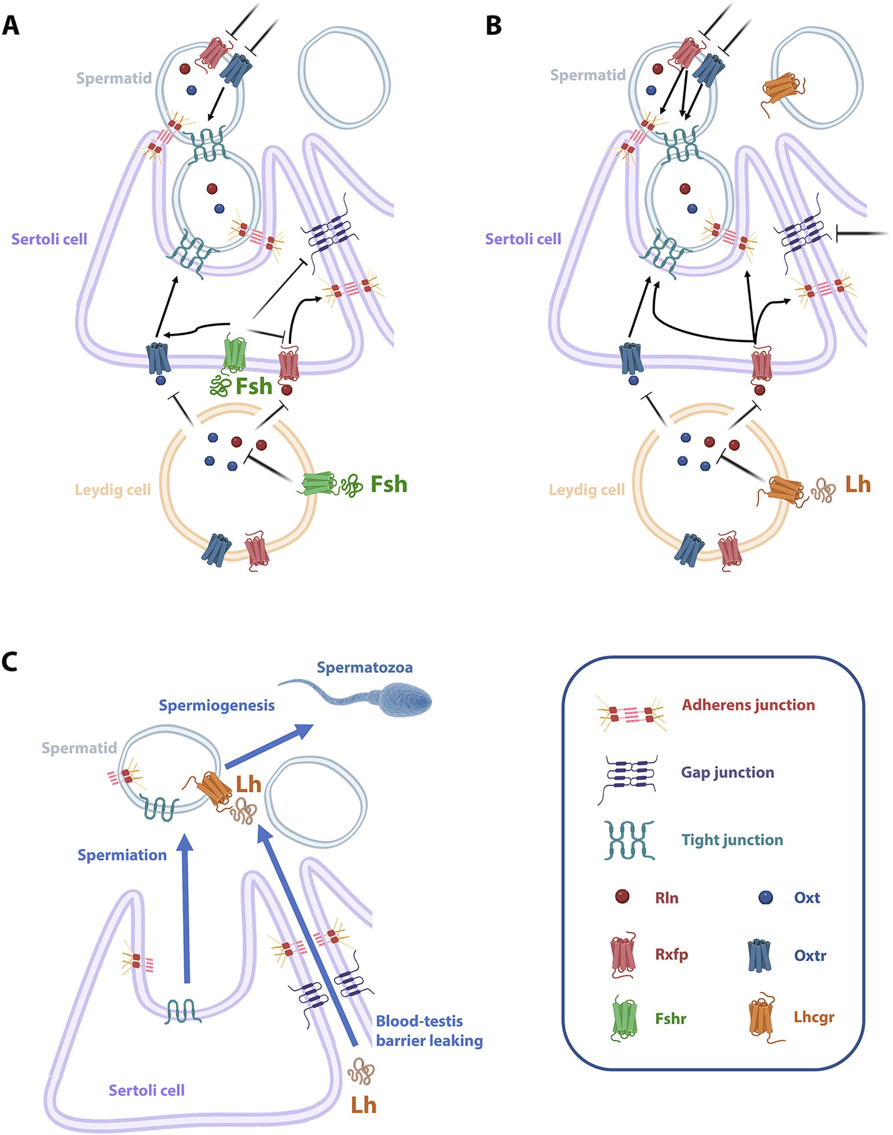 These data suggest that the Oxt- and Rln-mediated gonadotropic disruption of the BTB and Sertoli cells-spermatid junctions in the sole testis facilitates spermatid release and Lh paracellular transport into the seminiferous lumen during spermiogenesis.