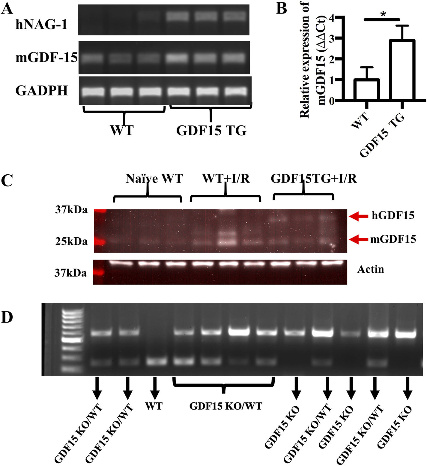 Characterization of mouse genotypes. Genotyping of mouse strain used in this study was performed. (A,B) Expression of human GDF15 (hGDF15) and mouse-derived GDF15 in GDF15TG mice and WT mice; (C) The expression of GDF15 proteins in mice underwent IRI. (D) Genotyping of GDF15KO and heterozygous GDF15KO/WT mice.