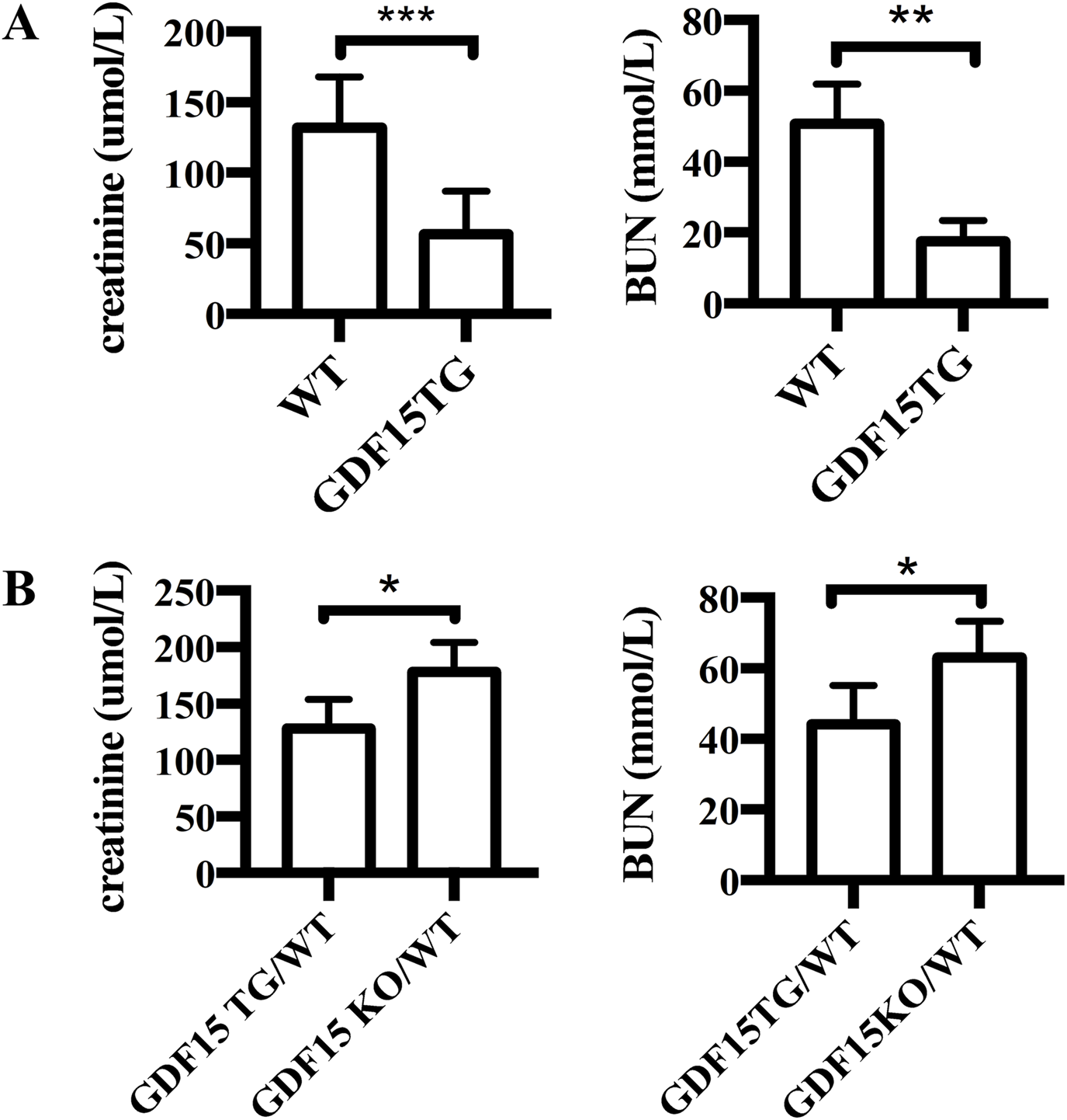 Overexpression of GDF15 protects renal function from IR injury. (A) Serum creatinine levels. The left kidney pedicle vessels were clamped for 55 min at 37°C, followed by 24hrs reperfusion. Renal function was determined by measuring the levels of serum creatinine (A) and BUN (B) 24 h after reperfusion. N = 6, *p < 0.05. ***p < 0.001.