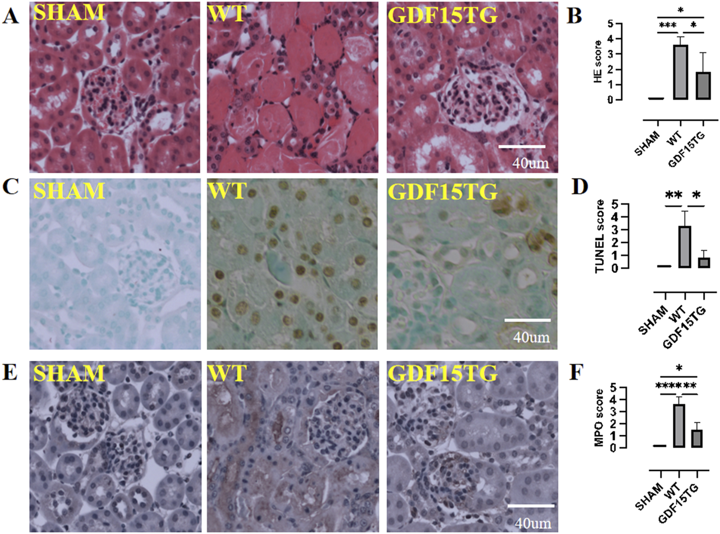 Overexpression of GDF15 reduces histopathological changes, cell apoptosis, and neutrophil infiltration. Animal were collected for histopathological changes by HE staining, cell apoptosis by TUNEL assays, and neutrophil infiltration by MPO staining 24hrs after reperfusion. Kidney injury, apoptosis, and MPO was semi-quantified using a five point score system based on degeneration of kidney: 0: no injury or no apoptosis, or MPO staining positive; 1: <10% area; 2: 11%–30% area; 3: 31%–60%; 4: 61%–90%; 5: >91%. (A) Representative images of HE staining; (B). Kidney injury score. (C) Representative images of TUNEL; (D) TUNEL score; (E) Representative images of MPO; (F) MPO score. n = 3-6, *p < 0.05.