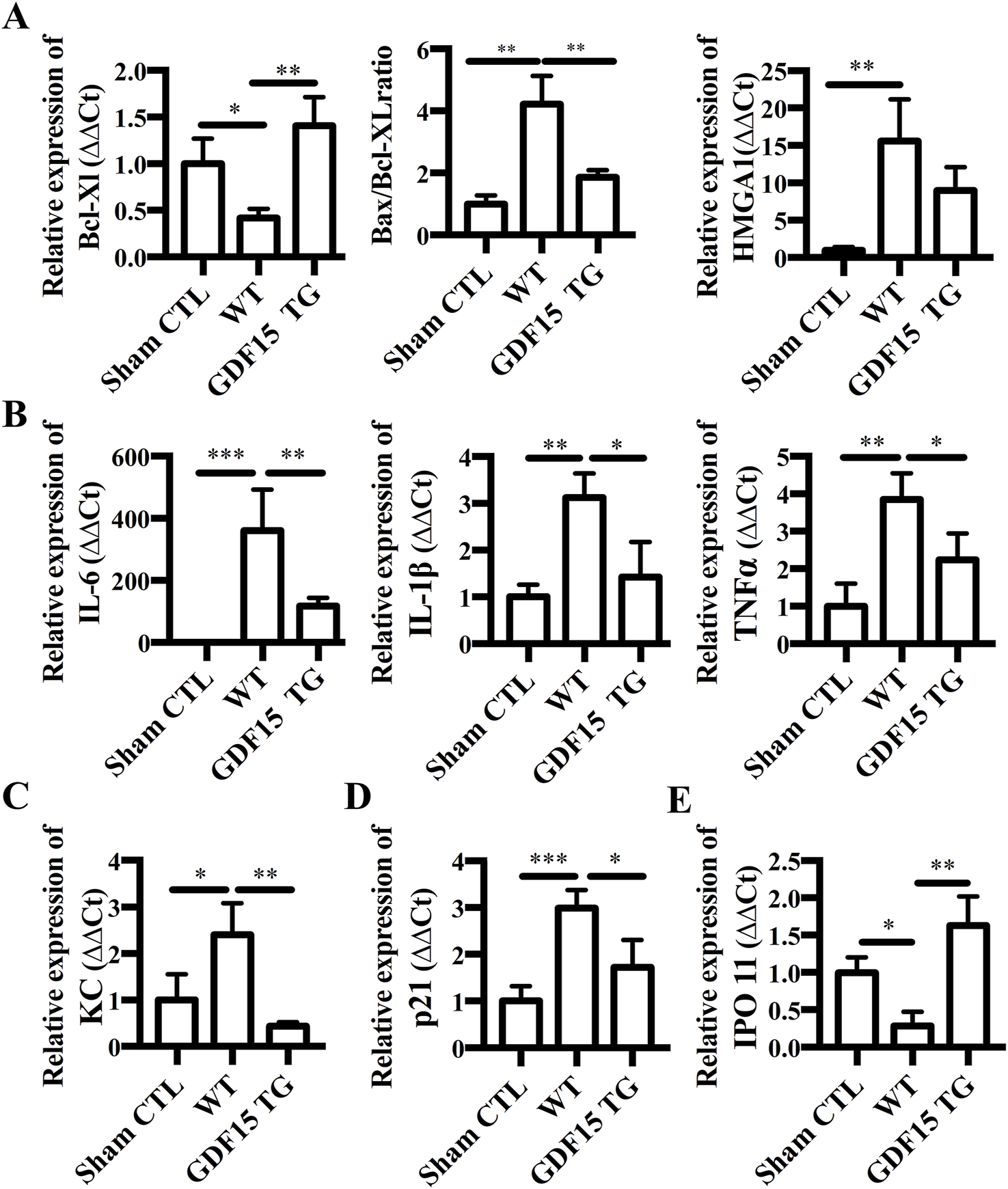 Overexpression of GDF15 reduces expression of apoptotic, inflammatory genes, KC, P21 and IPO 11. Total RNA was extracted from kidneys 24 h after IR and gene expression was measured by qRT-PCR. Relative gene expression was expressed as ΔΔCt, where GAPDH was used as an internal control. (A) Expression of Bcl-XL, Bax and HMGB1. (B) Expression of IL-6, IL-1β, and TNFα. (C) KC; (D) p21; (E) IPO 11. n = 4 per group, *p < 0.05.