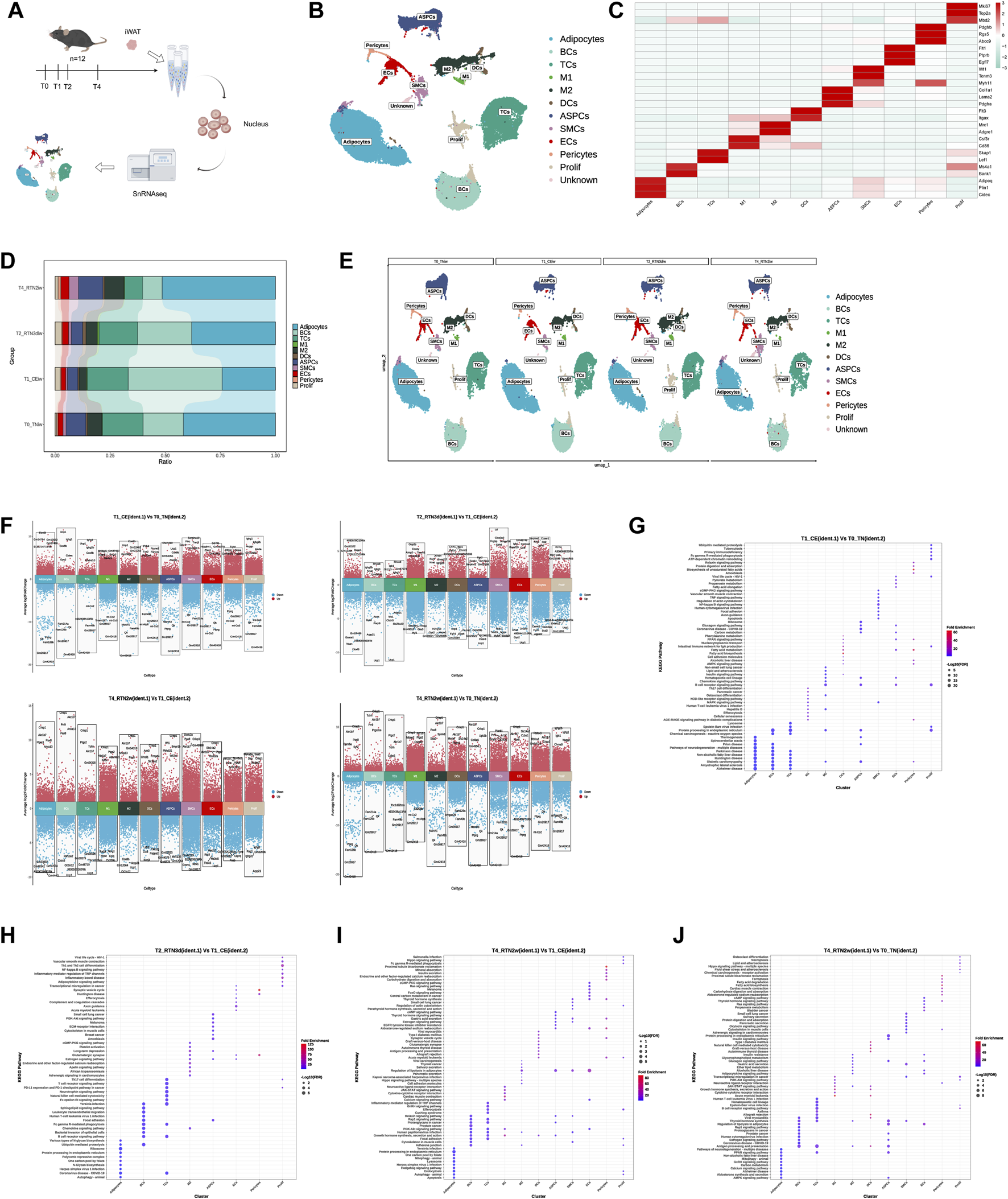 SnRNA-seq Reveals Dynamic Remodeling of Cell Composition and Gene Expression Profiles in iWAT Upon Return to Thermoneutrality After Cold Stimulation (A) Schematic overview of the snRNA-seq experimental workflow. Nuclei are isolated from the iWAT of mice at T0, T1, T2, and T4. Sequencing is performed using the 10x Genomics platform, followed by bioinformatic analysis. (B) UMAP of cells (n = 97,666) identified in iWAT across the four time points. Cell clusters include adipocytes, B lymphocytes (BCs), T lymphocytes (TCs), M1 macrophages (M1), M2 macrophages (M2), dendritic cells (DCs), adipose stem and progenitor cells (ASPCs), pericytes, endothelial cells (ECs), smooth muscle cells (SMCs), proliferation-related immune cells (Prolif), and an unknown cell type. (C) Heatmap showing the scaled average expression of highly variable genes and canonical markers across iWAT cell clusters. (D,E) Percent bar graphs and UMAPs showing the changes in the composition of the 11 cell types in iWAT under T0, T1, T2, and T4. (F) Volcano plots showing upregulated and downregulated genes in 11 clusters in the comparison group (ident.1) relative to the control group (ident.2). Upregulated genes (average logFC >0 and adjusted p-value <0.05) are shown in red, while downregulated genes (average logFC <0 and adjusted p-value <0.05) are shown in blue. (G–J) KEGG pathway enrichment analysis of upregulated genes in each cluster in the comparison group (ident.1) relative to the control group (ident.2). The top 10 pathways are shown for comparison.