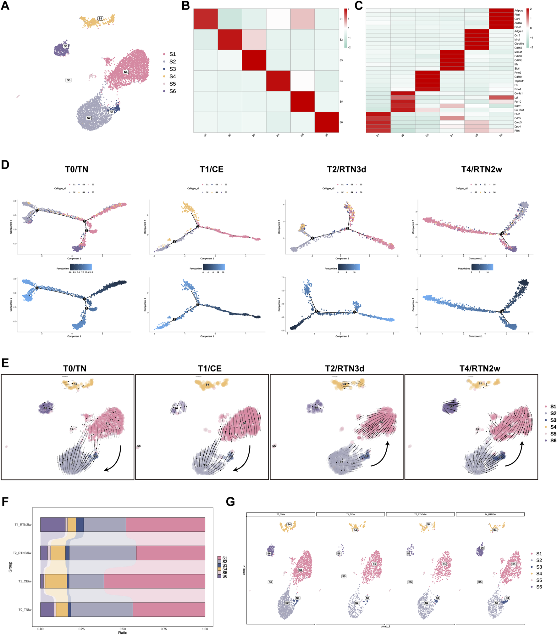 Shifting Subpopulation Differentiation Trajectories of ASPCs in iWAT Upon Return to Thermoneutrality After Cold Stimulation. (A) UMAP of subpopulations (S1-S6) identified within the ASPCs population following re-clustering. (B) Heatmap showing the average scaled gene module scores for the top 50 most significant genes within each ASPCs subcluster (S1-S6). (C) Heatmap showing the scaled average expression of highly variable genes and canonical markers across ASPC subclusters (S1-S6). (D) The trajectory inference of ASPCs subpopulations (S1-S6) across the T0, T1, T2, and T4. (E) The RNA velocity of ASPCs subpopulations (S1-S6) across the T0, T1, T2, and T4. (F,G) Percent bar graphs and UMAPs showing the changes in the composition of ASPC subpopulations (S1-S6) under T0, T1, T2, and T4.
