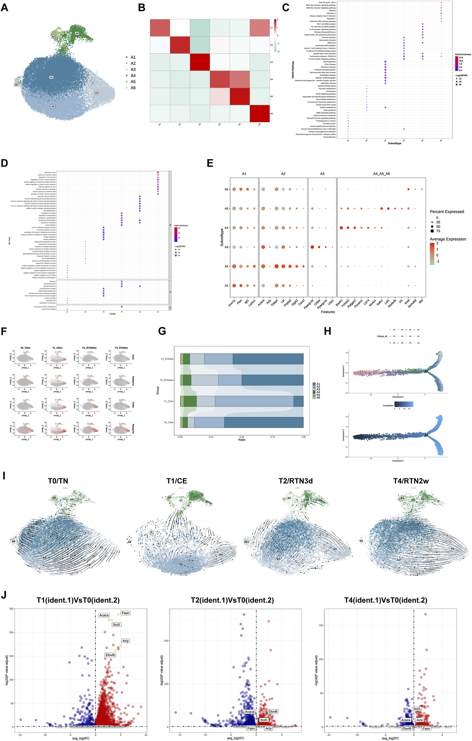 Reprogramming of Adipocyte Subpopulations in iWAT Upon Return to Thermoneutrality After Cold Stimulation. (A) UMAP of subclusters (A1-A6) identified within the adipocytes following re-clustering. (B) Heatmap showing the average scaled gene module scores for the top 50 most significant genes within each adipocyte subpopulation (A1-A6). (C) KEGG pathway and (D) GO enrichment analyses of differentially expressed genes across adipocyte subpopulation (A1-A6). The top 10 enriched pathways/terms are shown for comparison. (E) Bubble plot showing the expression of characteristic marker genes within adipocyte subpopulations (A1-A6). (F) Feature plots showing the expression of browning markers Ucp1, Ppargc1α, Ppargc1β, and Cidea in subcluster A3 across the T0, T1, T2, and T4. (G) Percent bar graph showing the changes in the composition of adipocyte subpopulatins (A1-A6) under T0, T1, T2, and T4. (H) Trajectory inference between ASPC subpopulations and adipocyte subpopulations. (I) RNA velocity analysis of adipocyte subclusters (A1-A6) across the T0, T1, T2, and T4. (J) Volcano plots showing the expression of DNL-related genes (Acly, Acaca, Fasn, Elovl6, and Scd1) in subcluster A3 at T1, T2, and T4 relative to T0. Upregulated genes (average logFC >0 and adjusted p-value <0.05) are shown in red, while downregulated genes (average logFC <0 and adjusted p-value <0.05) are shown in blue.