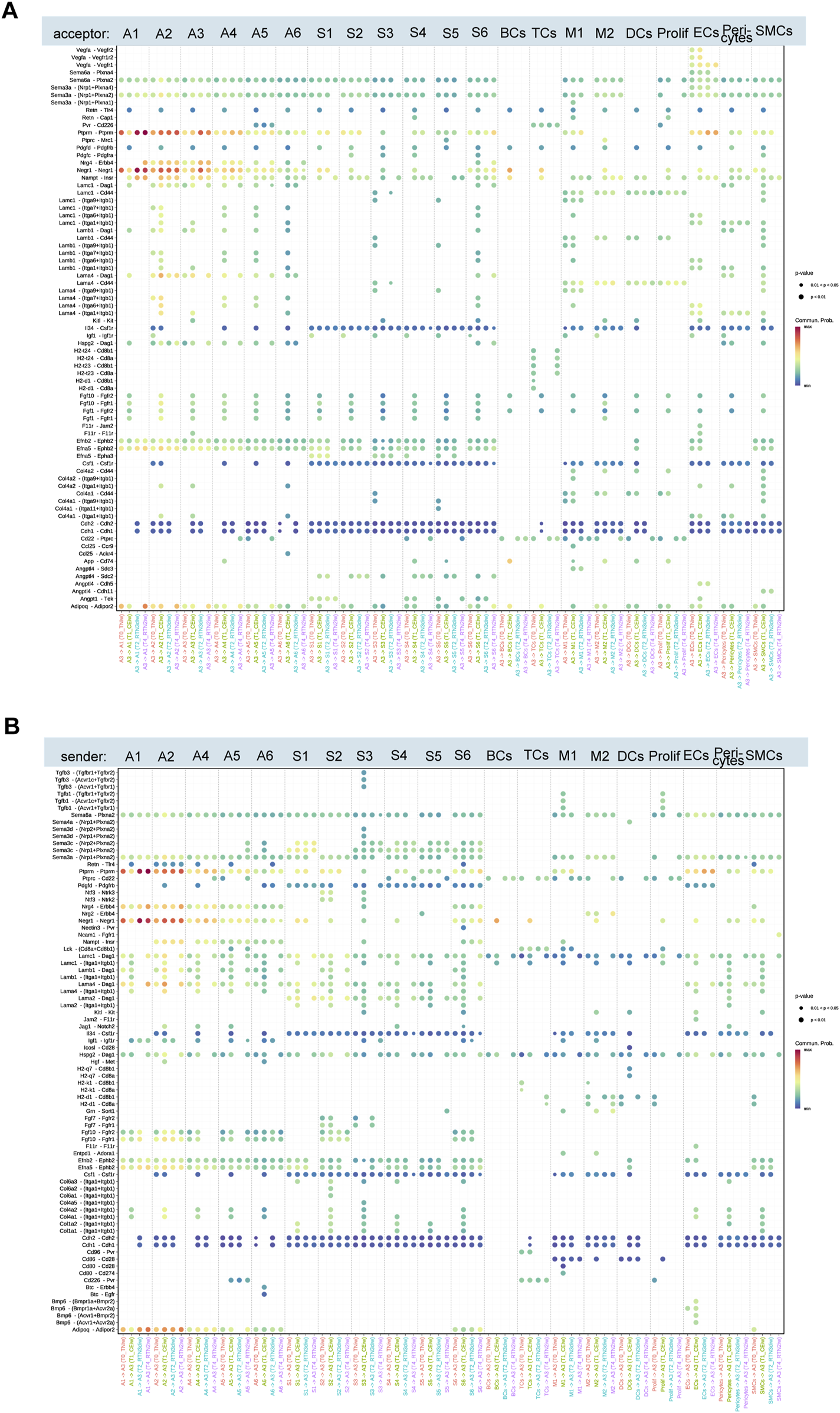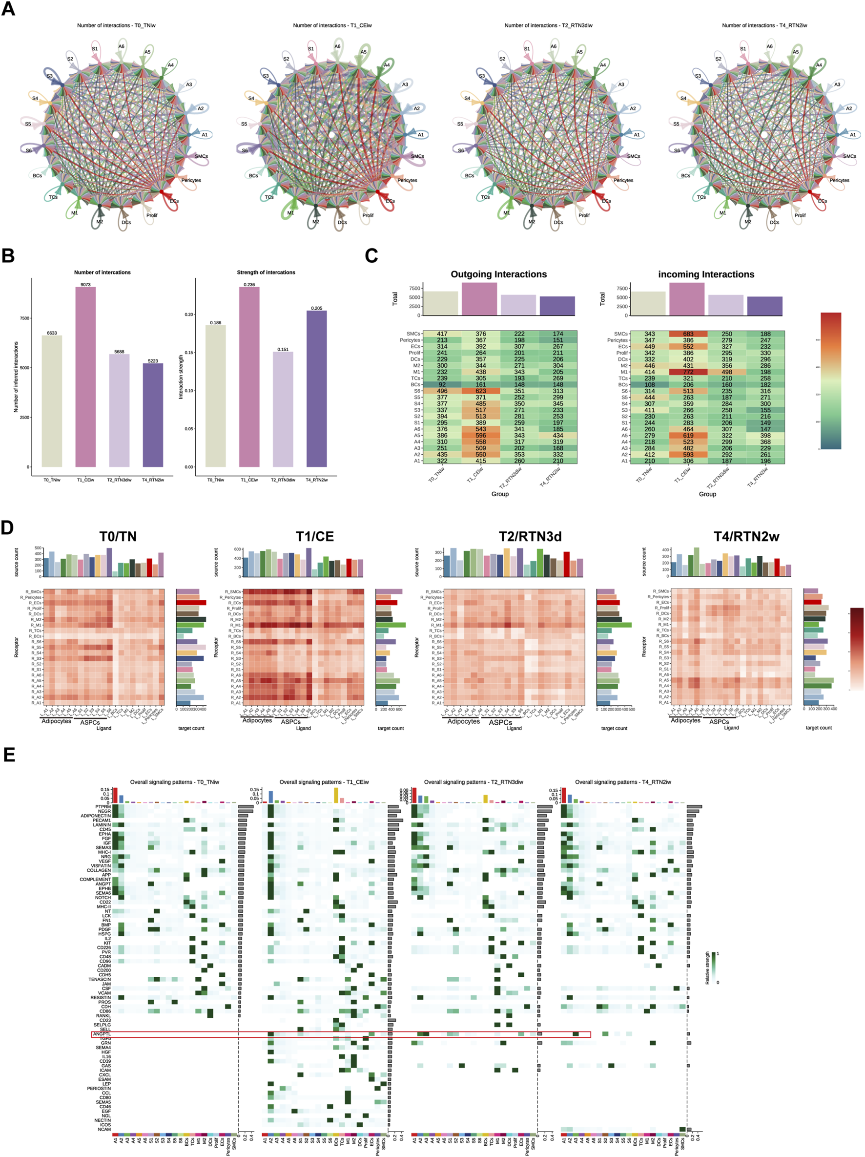 Ligand-receptor interactions were analyzed using CellChat (1.6.1) in R (4.3.2) (Jin et al., 2021). Cells from four time points (T0, T1, T2, T4) were aggregated by cell type (11 total) for CellChat analysis using the mouse ligand-receptor database and default parameters (with min cells set to 10). Communication networks were visualized using the netVisual_circle function, with each communication defined as a unique combination of sender cell type, ligand, receptor, and receiver cell type. The contribution of signaling pathways and ligand-receptor pairs to outgoing and incoming signals for each cell group was visualized using the netAnalysis_signalingRole_heatmap function. Significant interactions between selected cell groups across different conditions were visualized using the netVisual_bubble function.