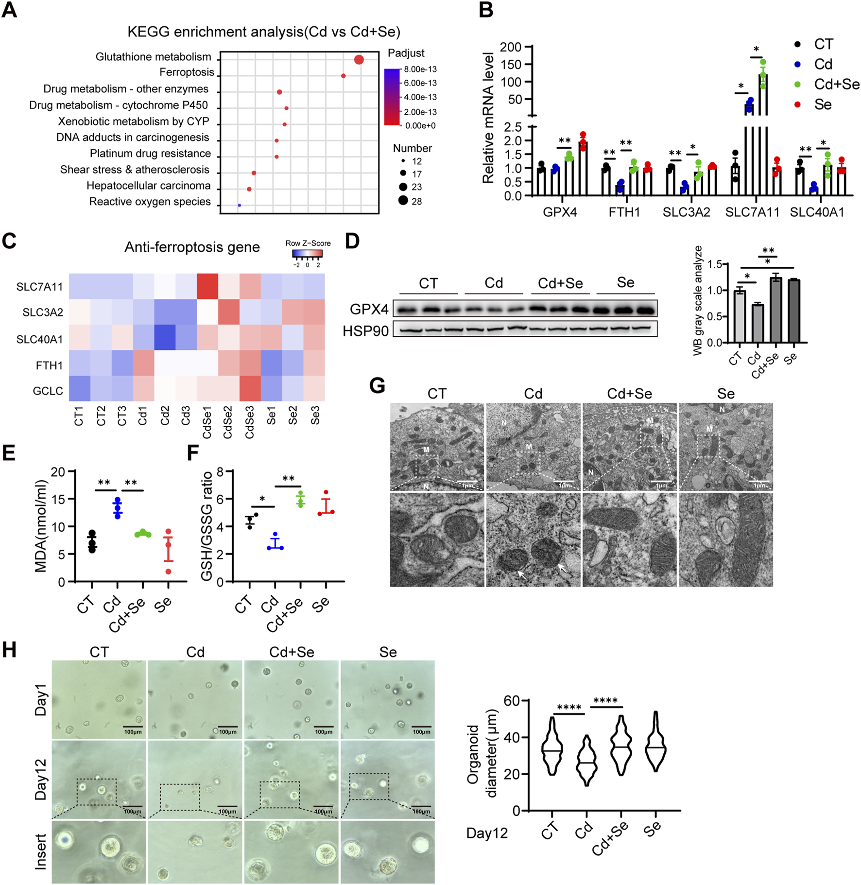 Figure 2. Ferroptosis contributes to Cd-induced liver damage. (A) Liver KEGG enrichment analysis and (B) Heat map of anti-ferroptosis genes in mice in the cadmium-treated and selenium-cadmium co-treated groups. (C) Expression of anti-ferroptosis genes in mouse liver by reverse transcription-polymerase chain reaction (RT-PCR). Values were normalized to the mRNA level of the housekeeping gene Actin in the respective sample. (D) Immunoblotting of GPX4 and Hsp90 in mouse liver. The right panel shows the quantitative analysis of GPX4 protein expression. (E) Malondialdehyde (MDA) levels and (F) GSH/GSSG levels were detected in the livers of mice. (G) Transmission electron microscopy of mitochondrial ferroptosis in AML12 cells. Representative mitochondria are shown in white boxes. Scale: 1 μm. N. nucleus; M. mitochondria. The white arrows indicate mitochondria exhibiting typical morphological features of ferroptosis, including reduced mitochondrial volume, increased membrane density, and decreased or vanished cristae structures. (H) Representative images of mouse liver organoids treated with 1.25 μM CdCl2 and 10 μM SeMet alone or in combination for 12 days. Statistical graph of class organ diameters (right panel). Scale: 100 μm. Data are expressed as mean ± SEM. Pairwise comparisons between groups were conducted using two-tailed non-paired Student’s t tests. ns, not significant (p ≥ 0.05); *p < 0.05; **p < 0.01; ***p < 0.001.