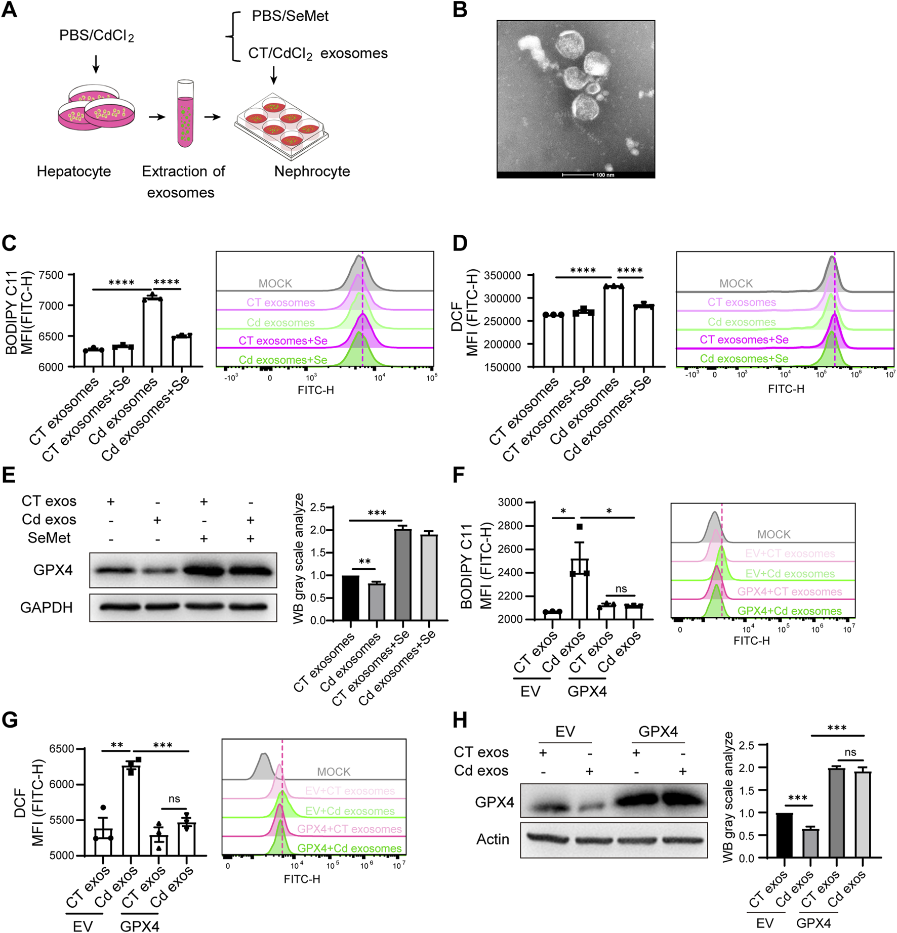 Figure 4. Cd-induced hepatorenal communication exacerbates renal ferroptosis via exosomes. (A) Pattern diagram: liver primary cells were isolated from mice and treated with PBS/CdCl2 for 24 h. Cell supernatants were collected and exosomes were extracted. HK2 cells were treated with CT/CdCl2 exosomes in combination with SeMet. (B) Representative images of the morphology of cellular supernatant exosomes observed by transmission electron microscopy. Scale: 100 μm. (C) Detection of BODIPY C11 and (D) ROS level of HK2 cells. HK2 cells were treated with CT/CdCl2 exosomes and SeMet for 24 h. (E) Immunoblotting for detection of GPX4 and GAPDH in CT/CdCl2 exosomes and SeMet HK2 cells. The right figure shows the quantitative analysis of GPX4 protein expression. (F) Detection of BODIPY C11 and (G) ROS level of HK2 cells. HK2 cells were transfected with either empty vector (EV) or a GPX4-overexpressing plasmid, followed by treatment with exosomes isolated from the supernatant of CT/CdCl2 treated Huh7 cells. (H) Western blot analysis of GPX4 and Actin expression in HK2 cells. The processing conditions are in accordance with those of (F) and (G). The right figure shows the quantitative analysis of GPX4 protein expression. Data are expressed as mean ± SEM. Pairwise comparisons between groups were conducted using two-tailed non-paired Student’s t tests. ns, not significant (p ≥ 0.05); *p < 0.05; **p < 0.01; ***p < 0.001.