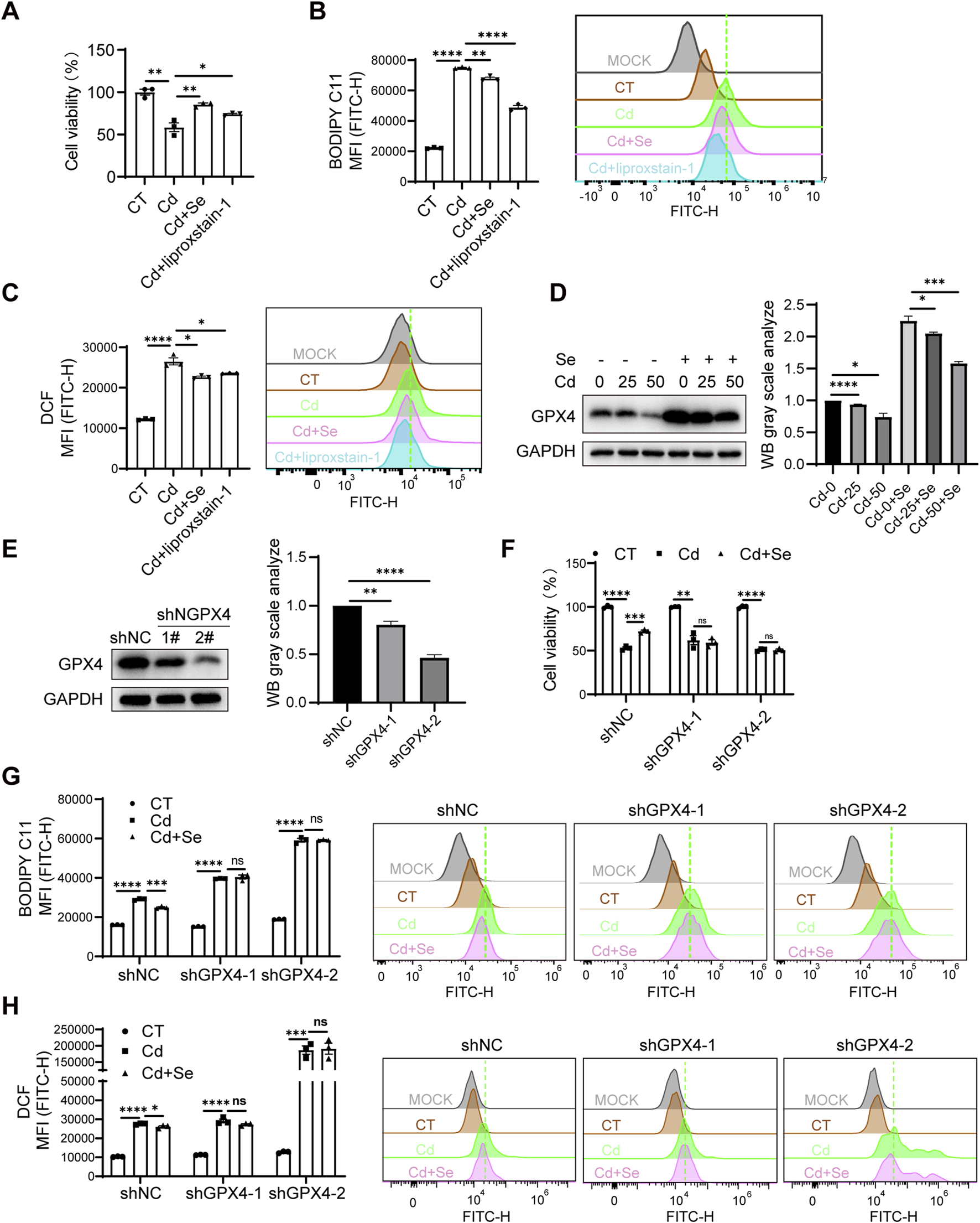 Figure 5. Antagonistic effect of Se on Cd-induced ferroptosis via upregulation of GPX4. (A) CCK8 assay for AML12 cell survival under SeMet, CdCl2 and ferroptosis inhibitor liproxstain-1 treatment. (B) Detection of BODIPY C11 and (C) ROS level of AML12 cell under different treatments. (D) Immunoblotting for detection of GPX4 in SeMet and CdCl2-treated AML12 cells. The right panel shows the quantitative analysis of GPX4 protein expression. (E) Immunoblotting for detection of GPX4 knockdown efficiency in AML12 cells. The right panel shows the quantitative analysis of GPX4 protein expression. (F) CCK8 assay cell survival of cell lines with AML12 knockdown of GPX4 after cadmium and/or selenium treatment. (G) Detection of BODIPY C11 and (H) ROS level of cell lines with AML12 knockdown of GPX4 after cadmium and/or selenium treatment. Data are expressed as mean ± SEM. Pairwise comparisons between groups were conducted using two-tailed non-paired Student’s t tests. ns, not significant (p ≥ 0.05); *p < 0.05; **p < 0.01; ***p < 0.001.