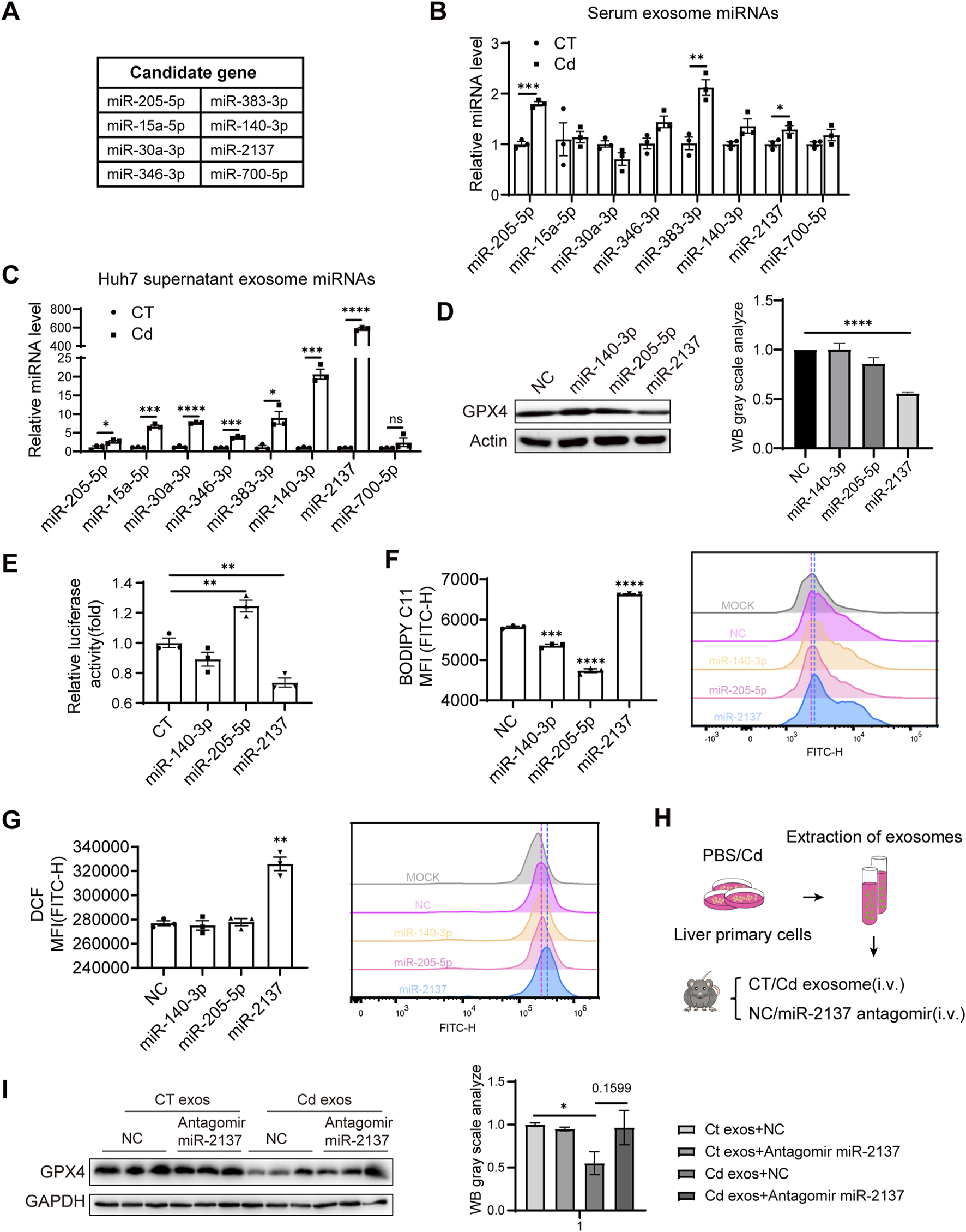 Figure 6. Cd-induced liver exosomal miR-2137 mediates renal cell ferroptosis and is blunted with Se. (A) Prediction of miRNAs targeting GPX4 using TargetScan. (B) Detection of serum levels of miRNAs targeting predicted miRNAs in control and CdCl2-exposed mice. (C) Detection of levels of miRNAs targeting predicted miRNAs in supernatant exosomes of PBS/CdCl2-treated Huh7 cells. (D) GPX4 and Actin levels were detected by immunoblotting after transfection of 293T for 48 h using miRNAs. The right panel shows the quantitative analysis of GPX4 protein expression. (E) Regulation of GPX4 3‘UTR by miRNAs was detected using dual luciferase in 293T cells. (F) Detection of BODIPY C11 and (G) ROS level in HK2 cells transfected with different miRNAs. (H) Pattern diagram: liver primary cells were treated with PBS/CdCl2 for 24 h, supernatants were collected and exosomes were isolated. Exosomes were injected into mice by tail vein and NC/miR-2137 antagomir treatment was given twice a week for a total of 2 weeks. (I) Immunoblotting to detect the expression levels of GPX4 and GAPDH in mouse kidney. The right panel shows the quantitative analysis of GPX4 protein expression. Data are expressed as mean ± SEM. Pairwise comparisons between groups were conducted using two-tailed non-paired Student’s t tests. ns, not significant (p ≥ 0.05); *p < 0.05; **p < 0.01; ***p < 0.001.